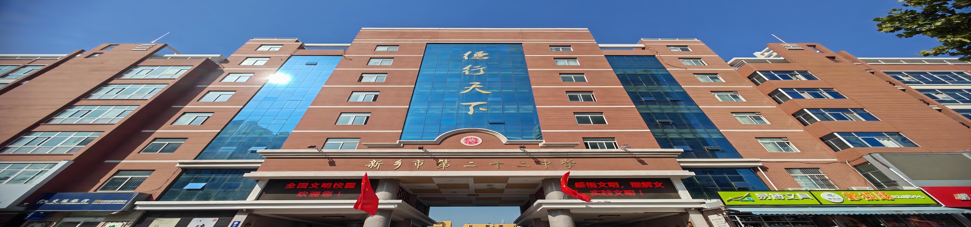 新乡市第二十二中学建于1979年,由健康路学校、南干道学校和育新学校的中学班组成。2009年学校根据新乡市委、市政府全市教育资源整合的统一部署,由金穗大道老校区整体迁入解放大道355号。经过几代二十二中人的努力,已成为社会关注,学生向往、群众期盼的一所名校。2017年11月被中央文明委确定为全国首届文明校园。 【完善的教学设施】学校占地面积27747平方米,建筑面积26397平方米,建有综合教学大楼、图书科技楼、办公楼、多媒体会议厅,塑胶篮球场、排球场、羽毛球馆、足球场和塑胶跑道,电子白板配备至每间教室,教育教学和管理等方面已初步实现信息化、数字化。学校还配备有高标准的理化生实验室、图书室、阅览室、音乐、美术教室、心理咨询室等功能性教室,各种功能区域分布合理,为教书育人、读书学习、生活锻炼提供了良好的校园环境。 【优良的教师队伍】学校拥有一支敬业、勤奋、博学、垂范的教师队伍。现有教职工205人,其中高级教师61人,中级教师76人。研究生学历25人,本科学历164人,专科学历17人。拥有特级教师2人,市级优秀专家3人、省级名师18人、市级名师7人. 【浓郁的校园文化】学校融合牧野文化的精髓,总结三十多年来的办学经验,挖掘提炼出厚重的“弘德”文化。全体师生以“德行天下”为校训,秉承“敬贤明智、静心修身”的校风,树立“博学立范、慧心琢璞”的教风,打造“书香涵慧、慎思明辨”的学风。在“弘德”文化的熏陶下,教师儒雅,学生文雅,校风淳朴。为使学校文化内化于心,外显于形,学校的景观、宣传版面、标牌、楼层指引、教案听课记录等统一做形象设计。围绕弘德文化确立了“德之修身,德之感恩、德之治学”等13个主题的走廊文化,内容均源自中国传统文化,悬挂在教学楼走廊之上,达到潜移默化的教育效果。