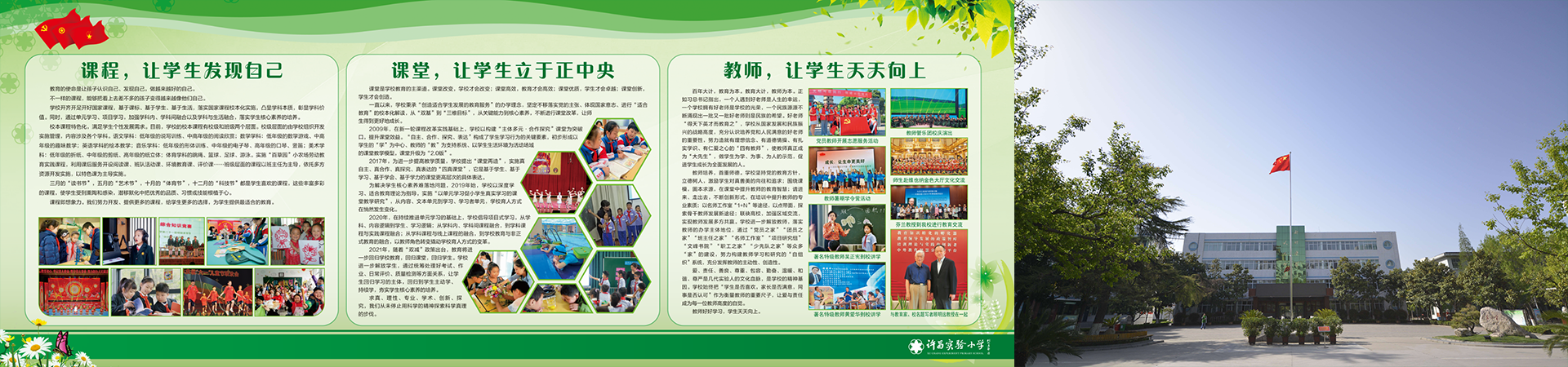 一、我们的学校 我校创建于1959年,是一所隶属于许昌市教育局管辖的六年制实验性学校。学校现有校本部、铁西校区、许都路校区、兰亭路校区四个校区。2010年8月经市教育局批准成立许昌实验小学教育集团。2020年11月被中央文明委表彰为“全国文明校园”。 二、我们的办学理念 创造适合学生发展的教育服务。 三、我们的校训 做真人,办实事。 四、我们的办学目标 努力创建“绿色、书香、人文、智能”校园。 五、我们的育人目标 培养气质儒雅、学有兴趣、身心健康、勇于担当的社会主义小公民。 六、我们的管理方略 学校坚持“五走进(近)”管理方略,即:学校管理要走近教师——教师是办学的主体,充分调动全体教职工工作的积极性和创造性,不断增强他们立志从教的使命感和职业自豪感;学生管理要走近学生——学生是学习的主人,尊重、保护、发展他们的各项权利,培养他们做德智体美劳全面发展的社会主义建设者和接班人;教学工作要走进课堂——切实发挥课堂主渠道的育人作用,培养学生自主、合作、探究、表达的学习能力,不断提高课堂教学效率;教育科研要走进课程——严格执行国家课程标准,择善使用地方课程,加强校本课程研究,不断提高教育科研水平,全面发展素质教育;“三结合”教育要走进社区——促进家庭、学校、社会三者有机结合,发挥学校教育的主导作用,努力让学校成为社区的文化中心。 七、我们的校风、教风、学风 校风:团结 勤奋 求是 有纪 教风:爱生 严教 求实 创新 学风:明理 勤学 求异 健康 八、我们的口号 哪里有实验小学的师生,哪里就有新风尚; 九、我们的成绩和荣誉 建校以来,学校先后被国家人力资源和社会保障部、教育部表彰为“全国教育系统先进集体”;被中央文明委表彰为“全国未成年人思想道德建设工作先进单位”“全国文明校园”;被中宣部表彰为“全国学雷锋活动示范点”;被省委、省政府命名为“文明单位标兵”“思想政治工作先进集体”“教育先进单位”;被国家教育部命名为“青少年体育工作先进集体”“艺术教育先进学校”;被全国妇联、国家教育部命名为“优秀(示范)家长学校”;被全国少工委命名为“红旗大队”“少先队先进集体”;被全国教育工会命名为“教育工会先进集体”;被省教育厅命名为“河南教育名片”“文明标兵学校”“河南省首批义务教育标准化管理示范校”“依法治校示范校”“安全文明学校”等。