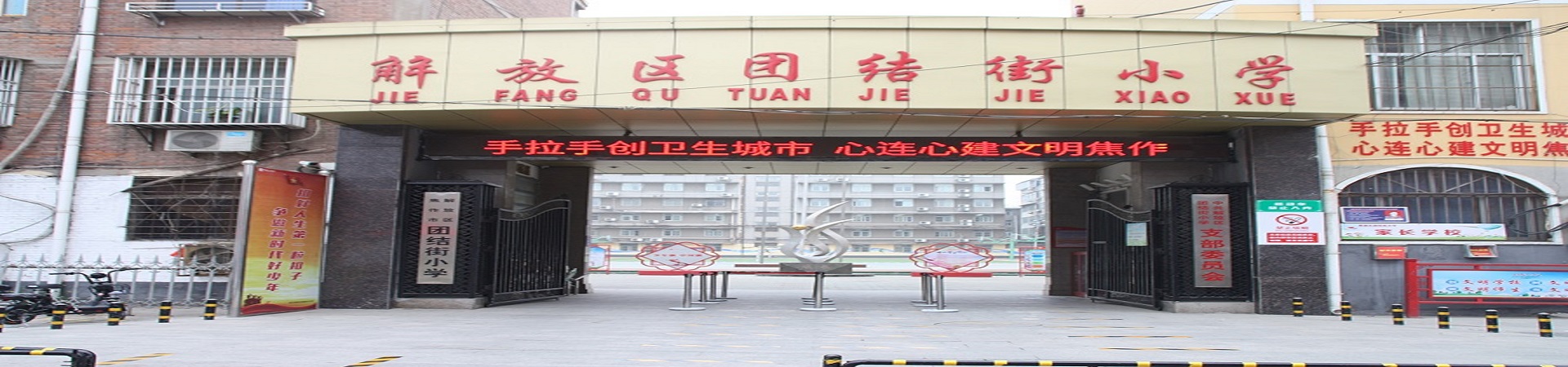 焦作市解放区团结街小学成立于1965年,始终秉承“以人为本,重在发展”的办学理念,以构建“和谐校园”为办学特色,把“让师生过一种幸福完整的教育生活”作为终极目标,一切工作的出发点和归宿就是为了人的和谐发展。在解放区委、区政府的大力支持下,学校的办学规模不断扩大,办学条件逐年改善。2014年,团结街小学合并焦作市解放区闫河小学为北校区,校园占地面积扩展至21000平方米,现有教职工135人,47个教学班,在校生2900余人。学校现有省级名师2人、市级名师3人。省级骨干教师11人,市级骨干教师15人,区级骨干教师13人。 学校先后荣获全国“读书育人特色学校”、 “新教育实验优秀实验学校”、全国青少年校园足球特色学校;河南省“健康单位”、“小学德育实验学校”、“首批语言文字规范示范学校”、“教育系统先进家长学校”、“民主行风评议先进单位”、河南省中小学体育艺术示范校、 第十三届河南省运动会健美操比赛冠军学校;焦作市“党建工作示范校”、“文明校园”、“师德师风先进单位”、“全市教育系统新闻宣传工作先进集体”“校园文化建设示范学校” “优秀体育传统项目学校”;解放区“优秀基层党组织”、“艺术教育工作先进学校”等殊荣。