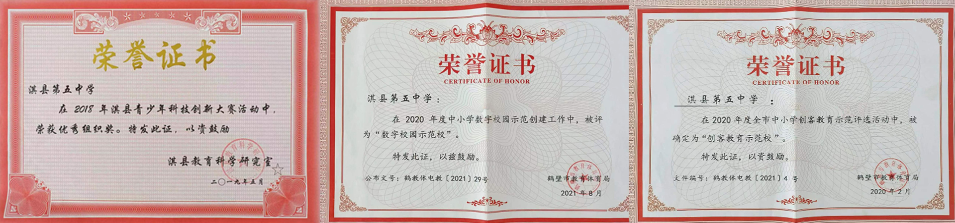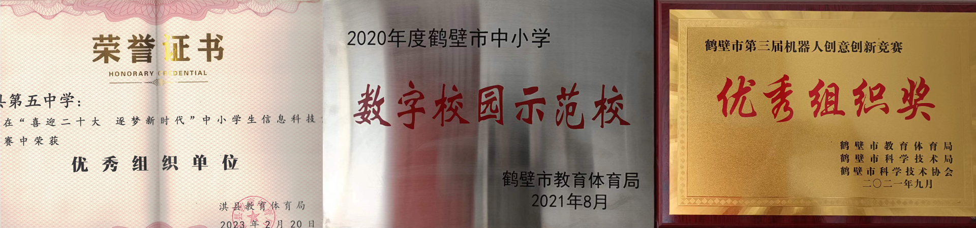 淇县第五中学简介 淇县第五中学始建于1980年,是鹤壁市首批示范性初中,现有36个教学班,在校学生2060人。教职工135人,100%的教师学历达标,96%的教师取得了本科学历。 学校环境优美、设施完备,“创品牌学校,育一流人才”是我校永远追求的办学目标,我们的校训是“修德、笃学、健体、尚美”校风是“团结、勤奋、求实、创新”教风是“勤奋敬业、传知育德”学风是“志存高远、勤学善思”. 我校原生态艺术剪纸特色课程是一大亮点,学校原生态剪纸艺术工作坊被评为河南省终身学习品牌,学校为县非遗剪纸传承基地。 按照国家和省定标准建有图书室、阅览室、物理实验室、化学实验室、生物实验室、体育器材室、音乐教室、美术教室、心理咨询室、计算机教室、网络直播互动教室和创客教室。各功能室配备有相应的设施和器材。图书室和心理咨询室有各类图书(期刊)10万余册。 我校坚持互联网+教育,多维度推进创客教育,互动直播教室,智慧黑板使用,积极推进数字校园建设,被评为市数字校园示范校、河南省中小学数字校园标杆校。2021年,学校投资30万元,为10个教学班、创客教室、党建室、剪纸工作室安装了智慧黑板;两个微机室投资30万更新了台式电脑。2022年投入2万多元,对学校的办公网络进行了升级改造,开展了网络安全知识宣传系列活动,为师生安全上网保驾护航。2022年至2023年2月,又投资80多万,将剩下的26个班级全部安装智慧黑板。为推动创客教育,学校投资25万元购买设备、整修教室,建成人工智能实验室、机器人教室、3D打印室,组建了创客教师团队和创客学生兴趣小组,利用每周五延时服务时间开展学习。创客社团教室积极指导学生参加创意编程、机器人大赛、河南省学生信息素养提升实践活动等,参赛作品多次获省级市级奖励,提升了学生信息创造与应用能力。 多年来学校教育质量始终处于全县领先位置,中考成绩连续多年蝉联全县第一;七八年级素质教育评估在全县也遥遥领先,学校先后荣获“省文明学校”“省学校文化建设百佳单位”“省示范家长学校”“市级文明校园”“市教学教研先进学校”“市平安建设先进单位”等一系列荣誉称号,受到社会各界的广泛赞誉。