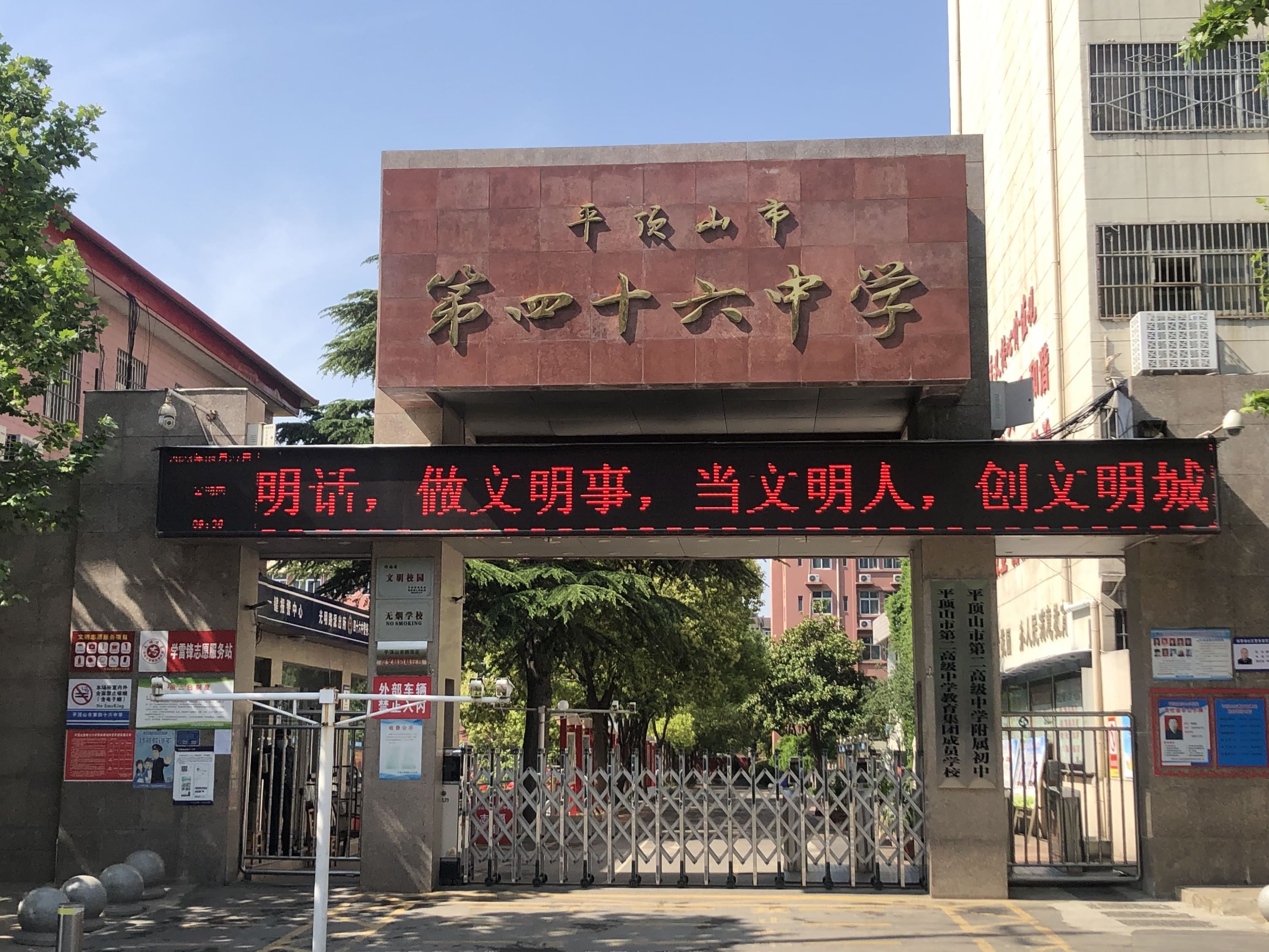 平顶山市第46中学始建于1974年,现位于矿工西路259号院(原实验高中院内),学校环境优雅,学习氛围浓厚,交通方便,是经市教体局批准的公办寄宿制学校。 学校现有编制102人,已形成了国家、省、市、校四级骨干教师梯队,其中省级名师2人,省级骨干教师7人,省级优质课教师13人,省市级学术技术带头人6人,市级骨干教师12人,市级优质课教师36人,市级名师6人,市级拔尖人才4人。 学校教学设施一流,理化生实验室、仪器设备及体育器材装备全部达到国家II类及以上标准;学校建有专门的学生宿舍楼、餐厅,住宿条件优越(每个宿舍4~8名学生,每个宿舍都有独立卫生间),学习环境良好。 学校坚持贯彻党的教育方针,不断完善教育教学管理制度,深入开展教学研究,大力推进特色校园文化建设,形成了“优秀+特长”的办学特色,力争让每一个学生都成为全面发展且有个性特长的优秀人才。学校先后获得了“河南省文明校园”、“河南省卫生先进单位”、“河南省园林先进单位”、“河南省德育工作先进集体”、“平顶山市基础教育先进集体”、“平顶山市教育科研先进单位”、“平顶山市先进基层党组织”等多项省市级荣誉。 学校办学理念先进,教学质量不断攀升,社会声誉持续上扬。在中招考试中,我校每年都有25%以上的学生被三所省级示范性高中录取。