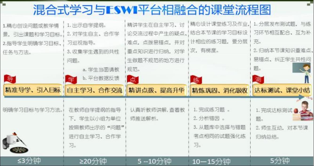 和教师专业发展的光明前景,实现让教育充满智慧,课堂充满活力,学习充满兴趣的改革目标,切实提高教学质量,促进学生人格成长,做有思想、有灵魂的教育,办人民满意的特色学校。学校决定实施构建智慧课堂实践探索活动,最终选择了网络空间 ESWI 智慧教学云平台,贯彻落实信息技术与教育教学的融合创新,深入探索混合式学习课堂的学习模式。在教学中认真落实核心素养目标,增强学生的人文底蕴,培养学生的科学精神,引导学生学会学习,健康生活,培养学生责任担当、实践创新精神。自此课堂教学改革进入了混合式学习(2016 年—至今)3.0 时代。