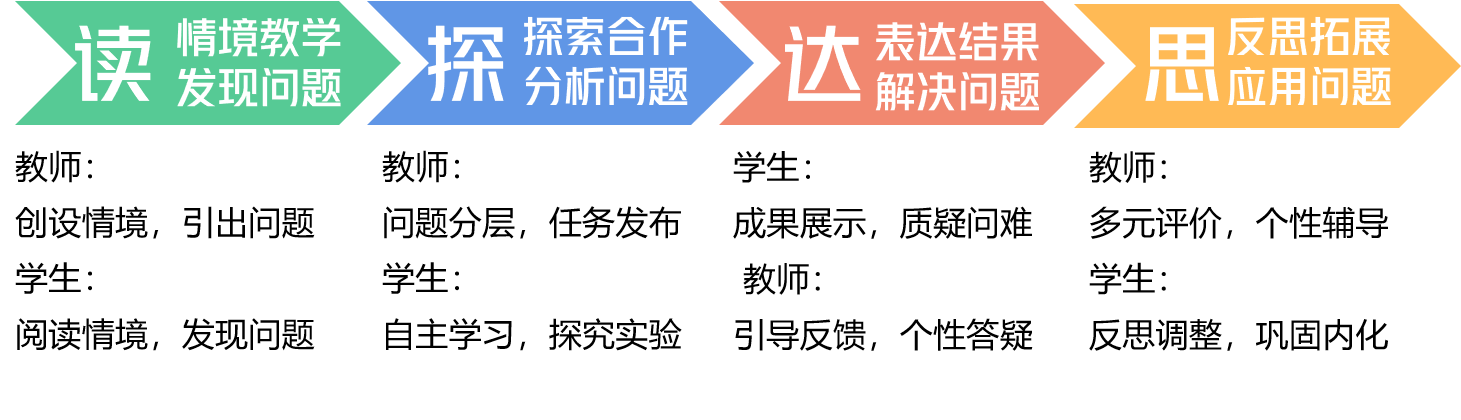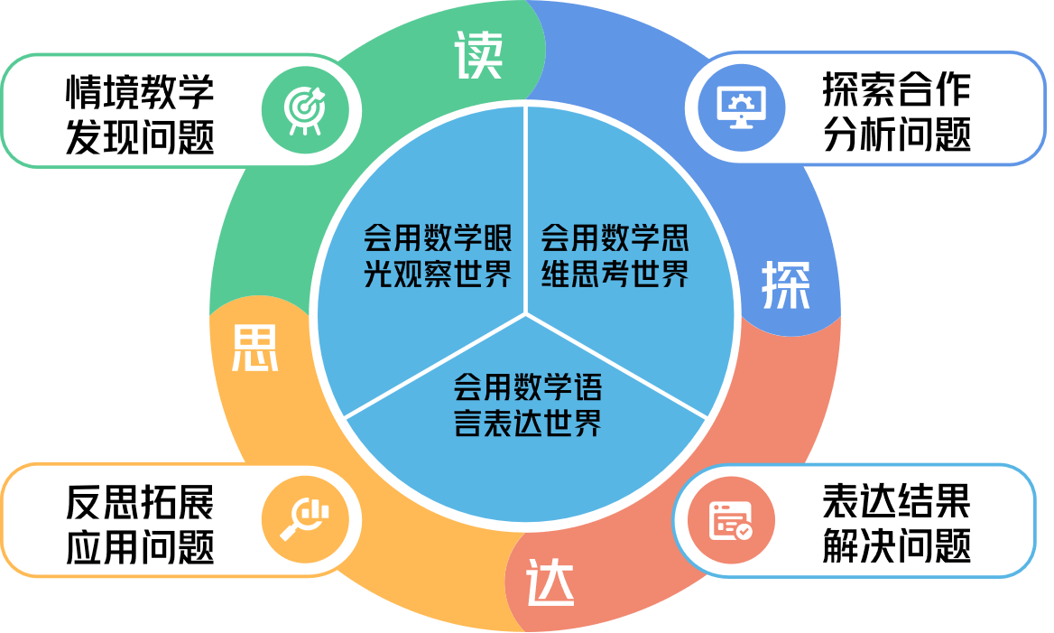 《义务教育数学课程标准(2022年版)》指出:课程目标以学生发展为本,以核心素养为导向,进一步强调学生获得数学基础知识、基本技能、基本思想和基本活动经验,发展运用数学知识和方法发现、提出、分析和解决问题的能力,形成正确的情感、态度和价值观。“三会”是培养学生核心素养的三个方面,包括:“会用数学的眼光观察现实世界”“会用数学的思维思考现实世界”“会用数学的语言表达现实世界”,且核心素养具有整体性、一致性和阶段性。“四环”是支持核心素养落地的四个教学环节,包括:“读:情境教学,发现问题”、“探:探索合作,分析问题”、“达:表达结果,解决问题”、“思:反思拓展,应用问题”,简称DTDS教学模型。“三会”为“四环”导向,“四环”为“三会”落实搭建教学框架,进而使整个教学流程有标可依。