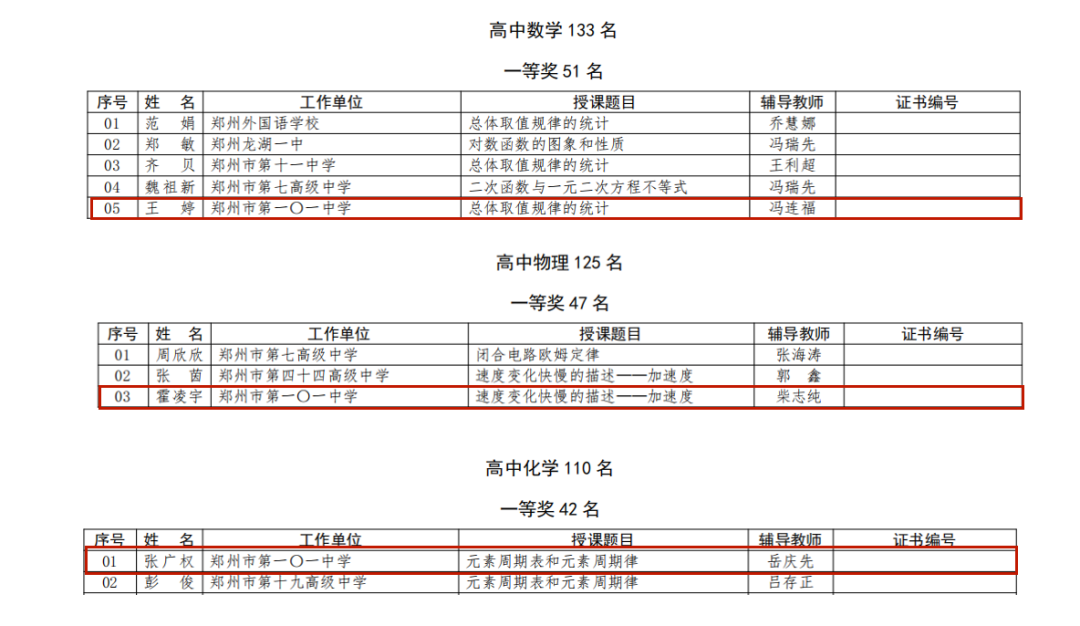 近日,河南省2022年度普通中小学、幼儿教育优质课教学评选活动结果揭晓,郑州101中学王婷、霍凌宇、张广权三位青年老师荣获2022年河南省优质课大赛一等奖。