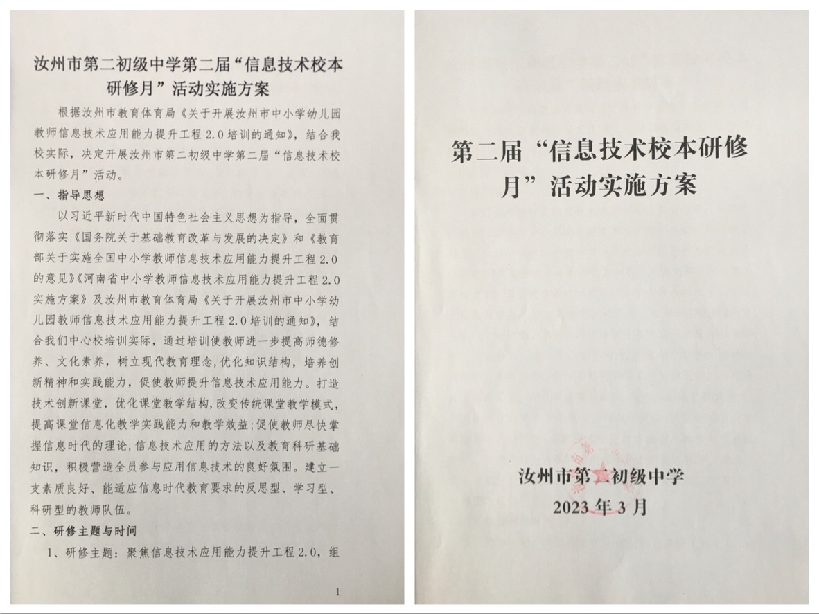 教研处制定《汝州市二中校本研修计划》《汝州市二中校本应用考核方案》《汝州市二中信息化教学发展规划》《“一五十”定向辅导各类教师名单》等,以全体教师(50岁以下)为培训对象,主带副教师按主科培训。