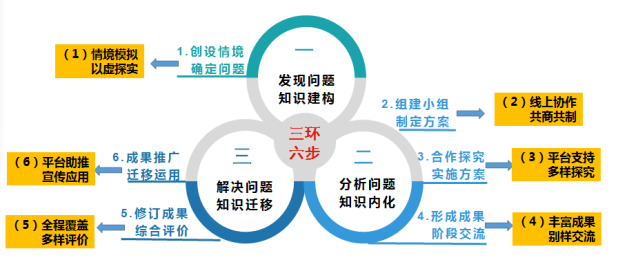 我校自2017年开始对项目学习进行初步尝试,依据PBL实施流程,和我校校情和学情,形成适合本校的项目学习流程,探索出项目学习实践的 “三环六步法”,随后,又总结出信息技术支持下的项目学习“三环六步法”模式应用范例。如下图: