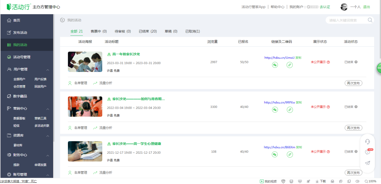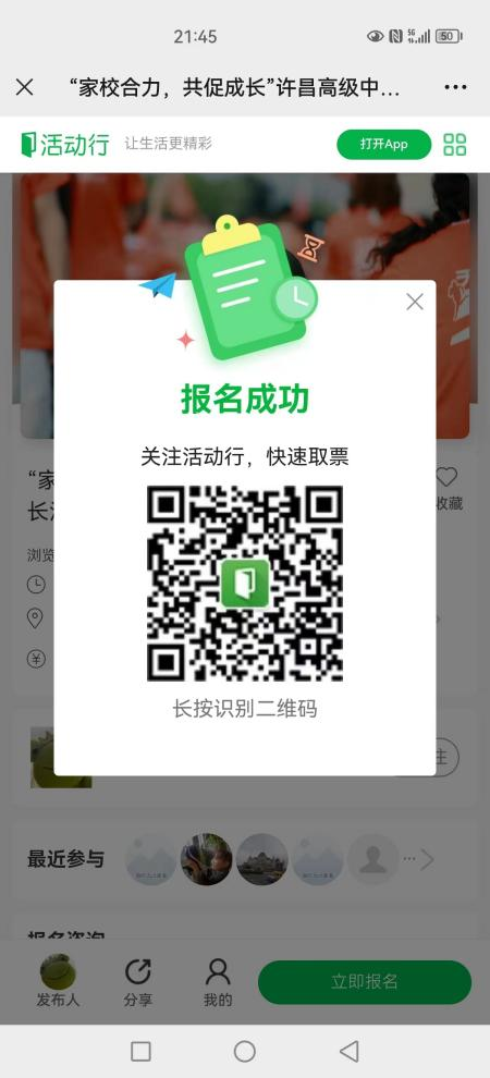 许昌高中家长学校会不定期举行家长沙龙活动,活动采用线上订票,线下开展的方式。“网上订票活动行”网站上生成二维码,发给家长,由家长自愿扫码报名。