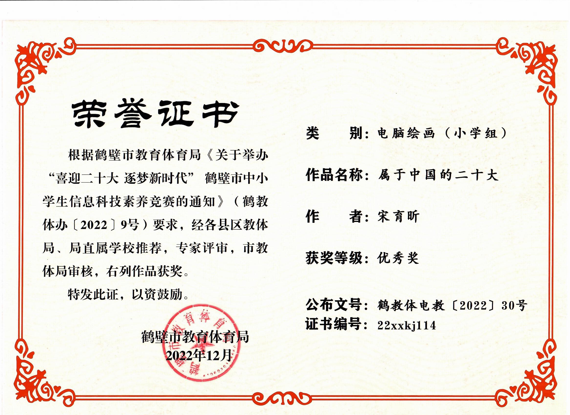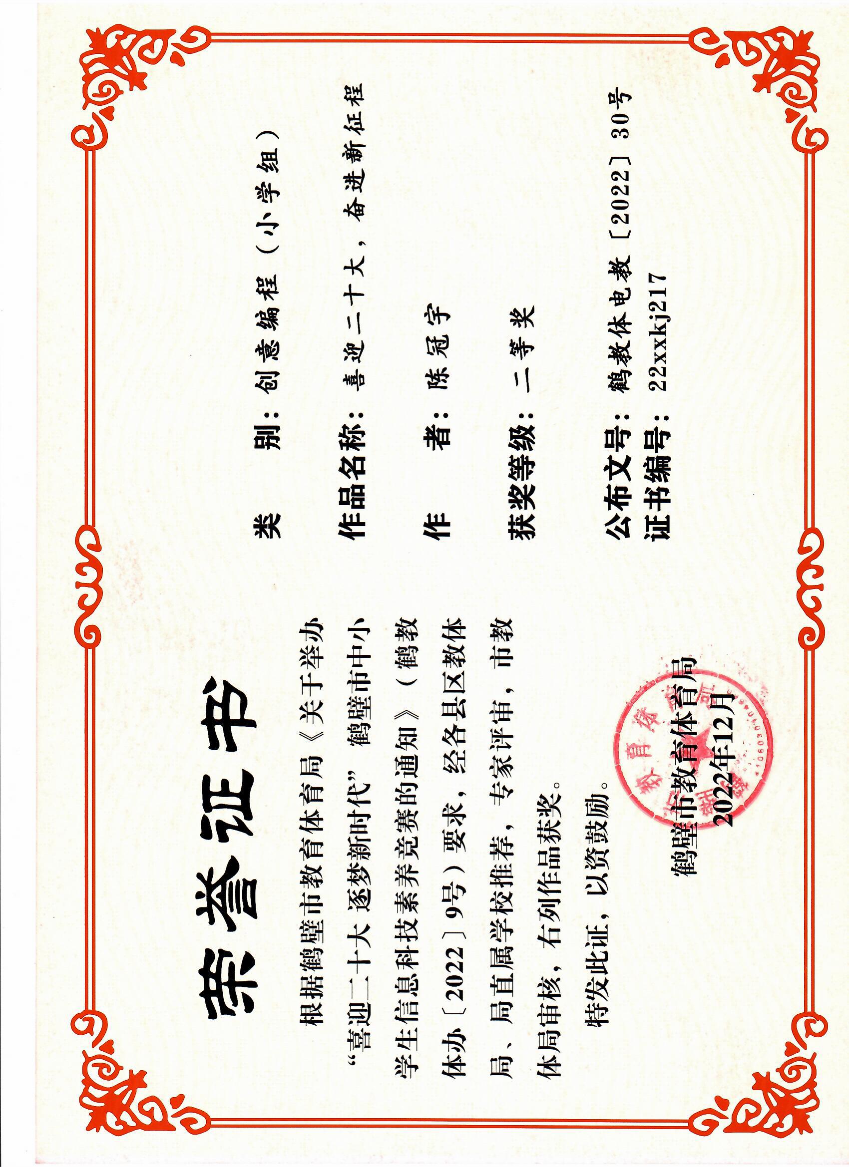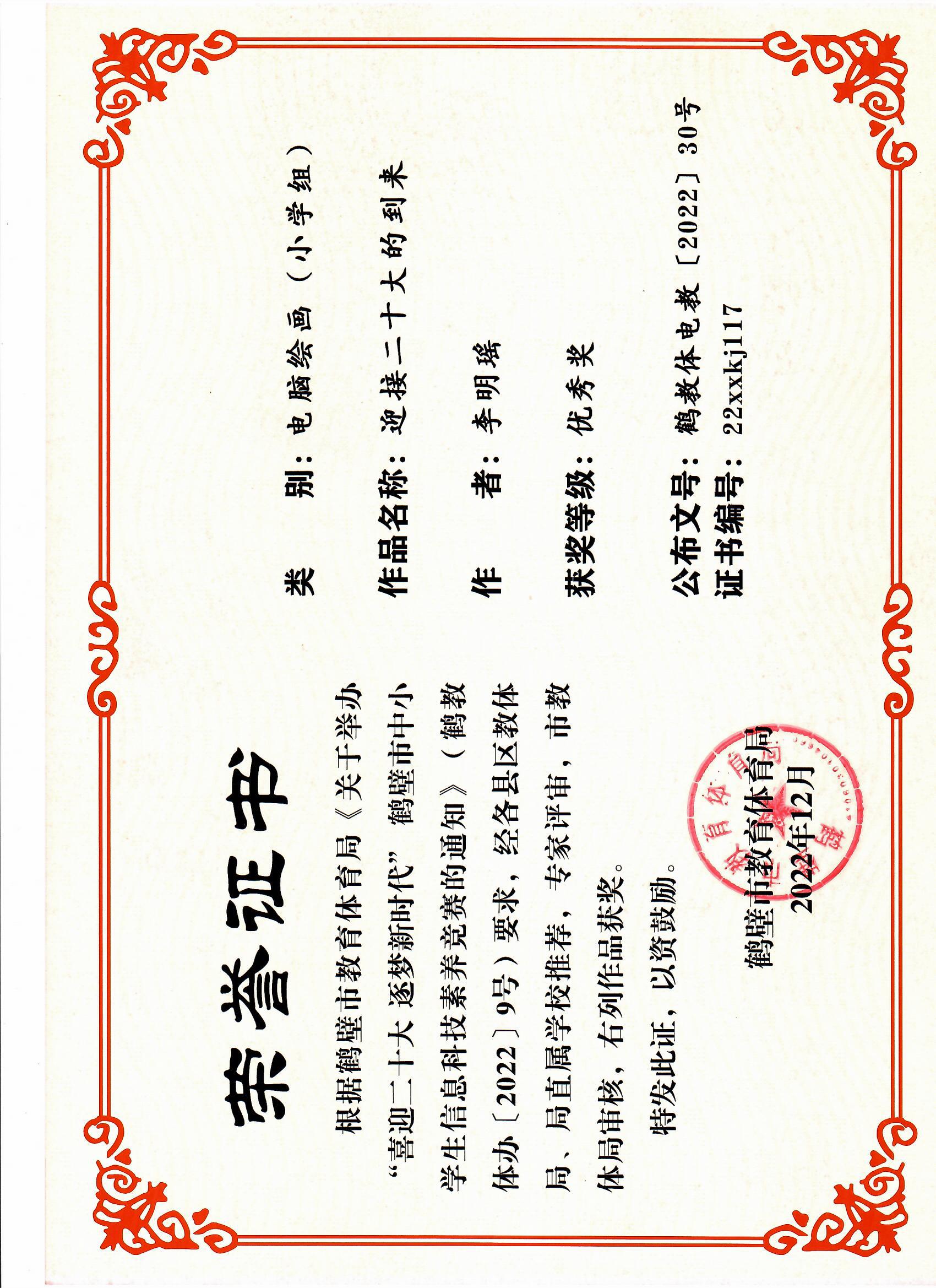 在喜迎二十大电脑绘画和编程活动中荣获一、二等奖多名,为了表达对祖国的喜爱,同学们纷纷通过绘画和编程表达了对祖国的热爱,同学们的积极性非常高,并且在此比赛中获得了诸多荣誉。