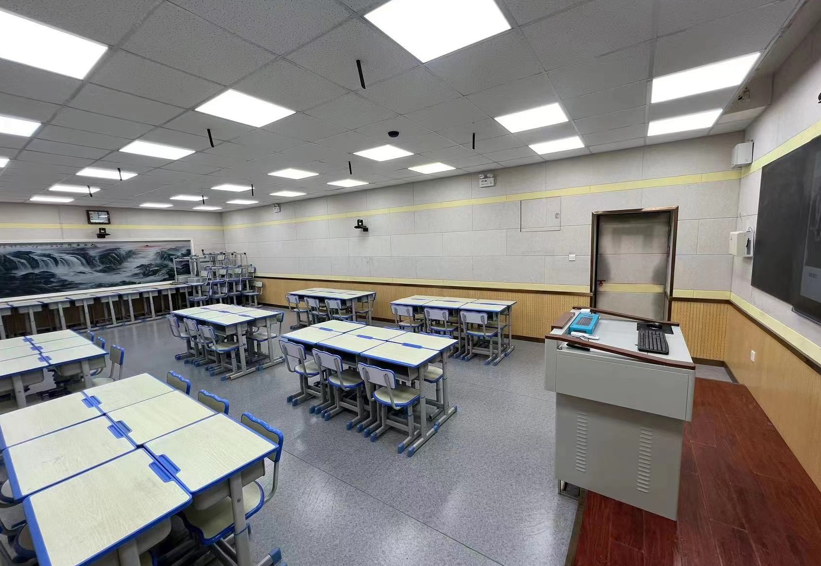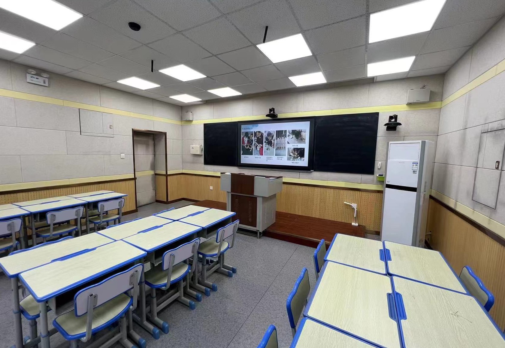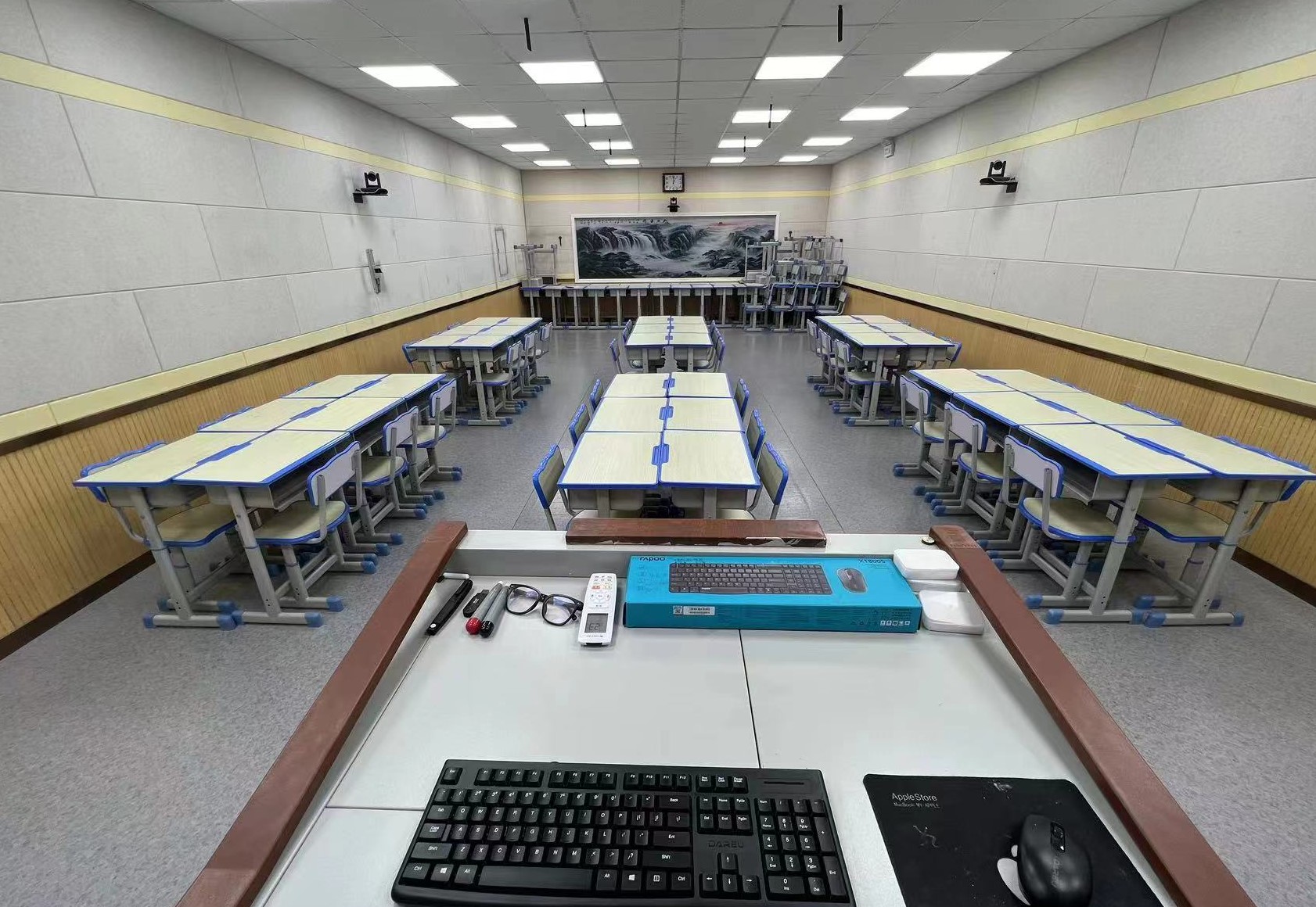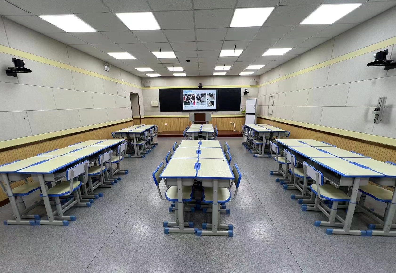 录播教室有上课教室、听课教室两部分组成,中间有单项透视玻璃隔断,可全自动录制,支持云存储、实时直播分享等。