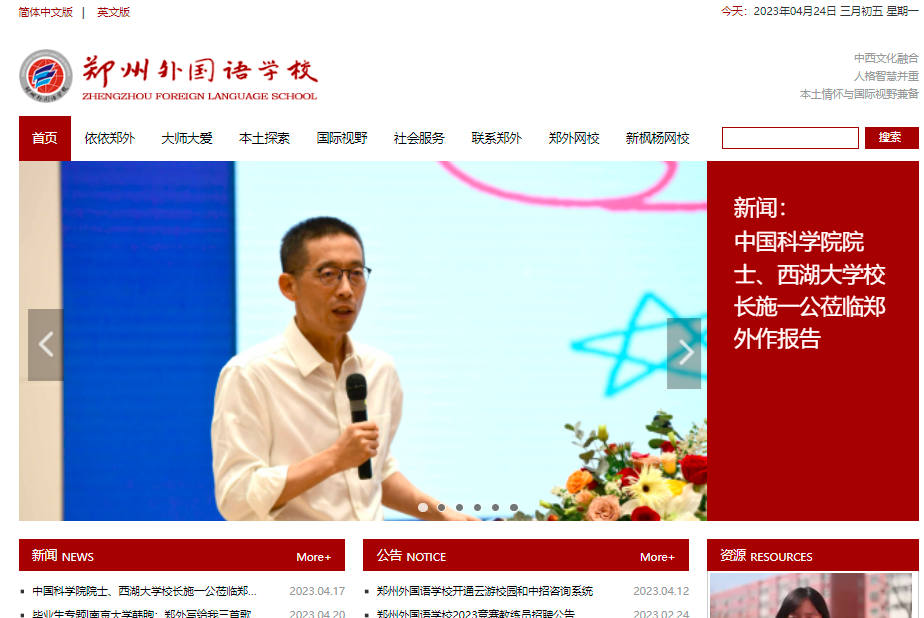 郑州外国语学校官方网站是一个为学校全体师生提供各类教育教学服务的综合服务平台,包括最新的学校新闻资讯、优秀的师生文章、丰富的学校资源库、优质的教学应用等精彩内容。