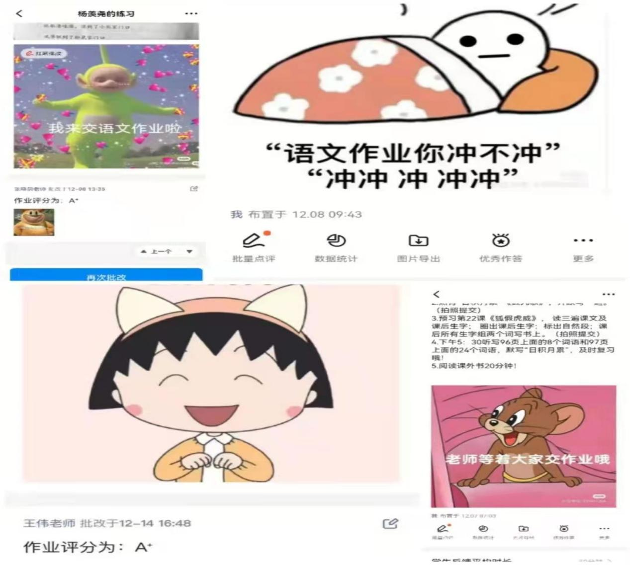 语文课堂:老师们开启花样教学,利用PPT、视频、知识清单、早上阅读打卡、趣味作业、课堂互动等,最大限度提高学生的学习效率。针对作业中一些较难的题目和学生容易出现错误的题目,以文字和语音的形式对学生进行指导,还会录制作业指导视频等多种形式为孩子们线上学习提供保障。