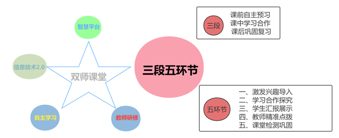 受疫情影响,为保证“双师课堂”的正常开展,我校充分发挥信息技术2.0示范校的优势,通过企业微信与智慧教育平台的联动操作来直播上课,以自主学习和教师研修作为“双师课堂”的两翼,相辅相成,在课堂中实行“三阶段五环节”,以便教师能够娴熟地完成“双师课堂”教学活动。