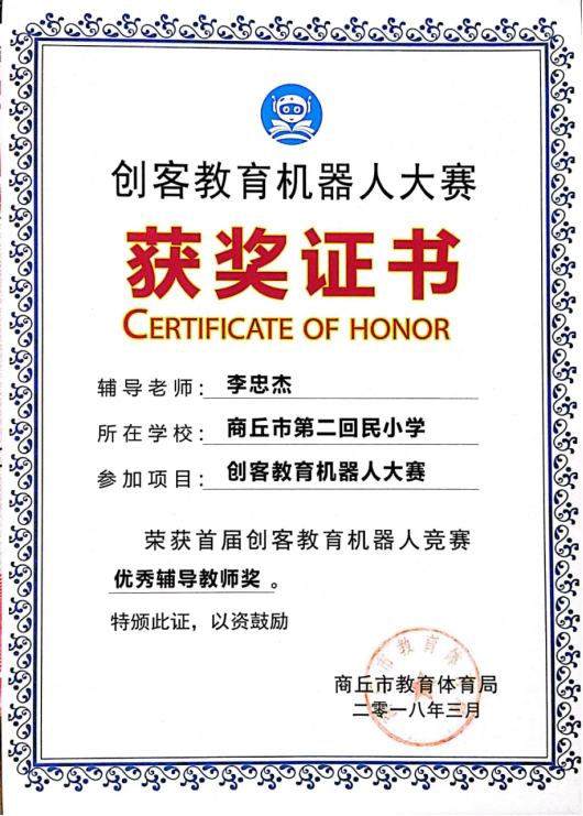 李忠杰老师辅导的学生参加商丘市首届创客机器人获奖
