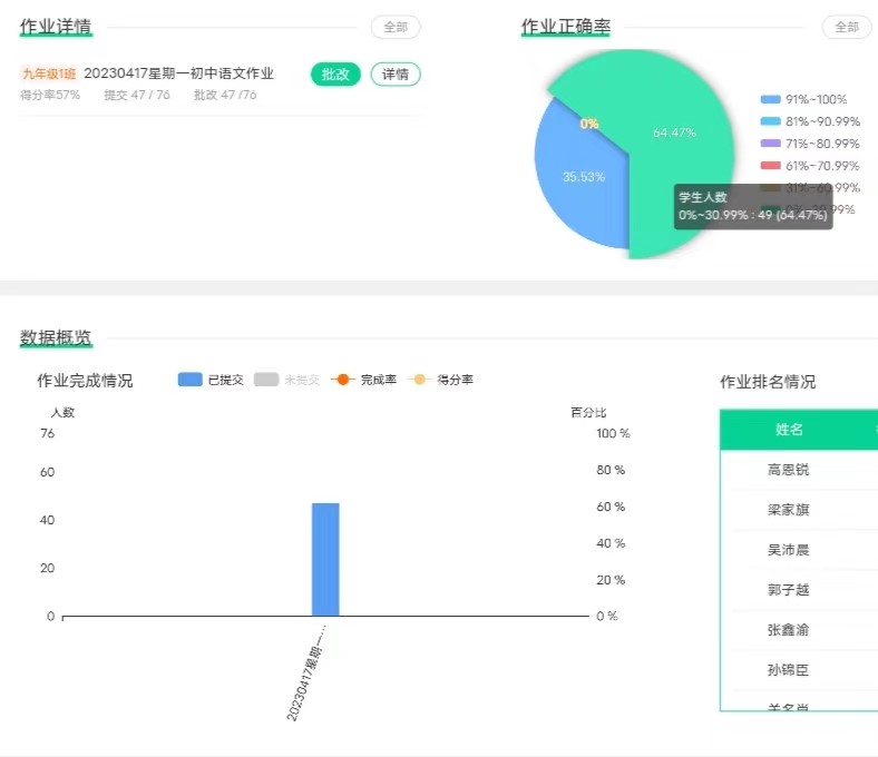 1.通过作业服务收集学生线上或者线下的作业,可以设置时间,进行作业过程化的管理,对于每一个题目的作答情况都会进行详细的统计以及趋势图。以便老师和学生及时的了解自己的学习情况。