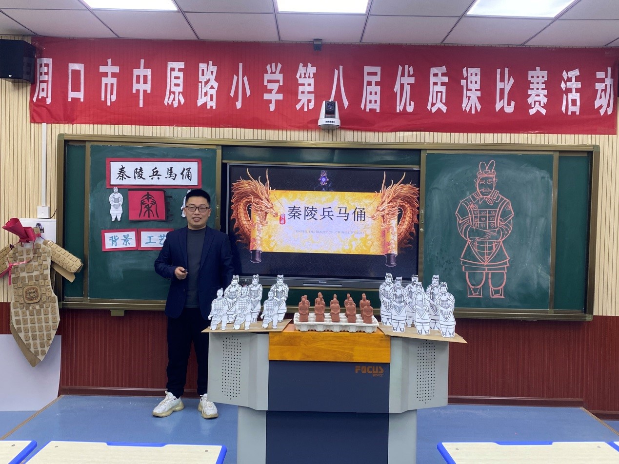 体音美学科的微课展示更是大放异彩。瞧,英语老师全英授课,语法功底深厚,情境创设极具吸引力,引导学生入情入境;体育老师动作标准规范,一步步进行足球动作的分解与示范,一招招拉近学生与足球的契合,整个展示活力满满;音乐老师亲切甜美,讲解歌唱像百灵鸟一样动听,课堂氛围轻松愉快,不觉让人沉浸其中;美术老师基本功扎实,惟妙惟肖的兵马俑教具和逼真的板书,带领各位评委老师进入古色古香的兵马俑世界,沉浸在磅礴的历史文化中……