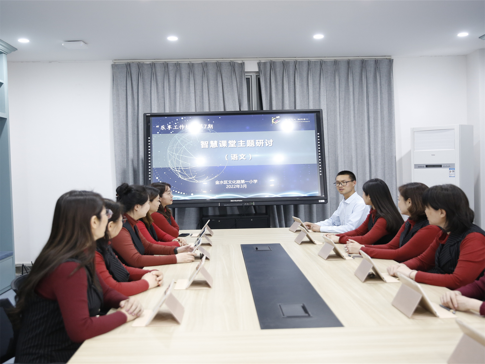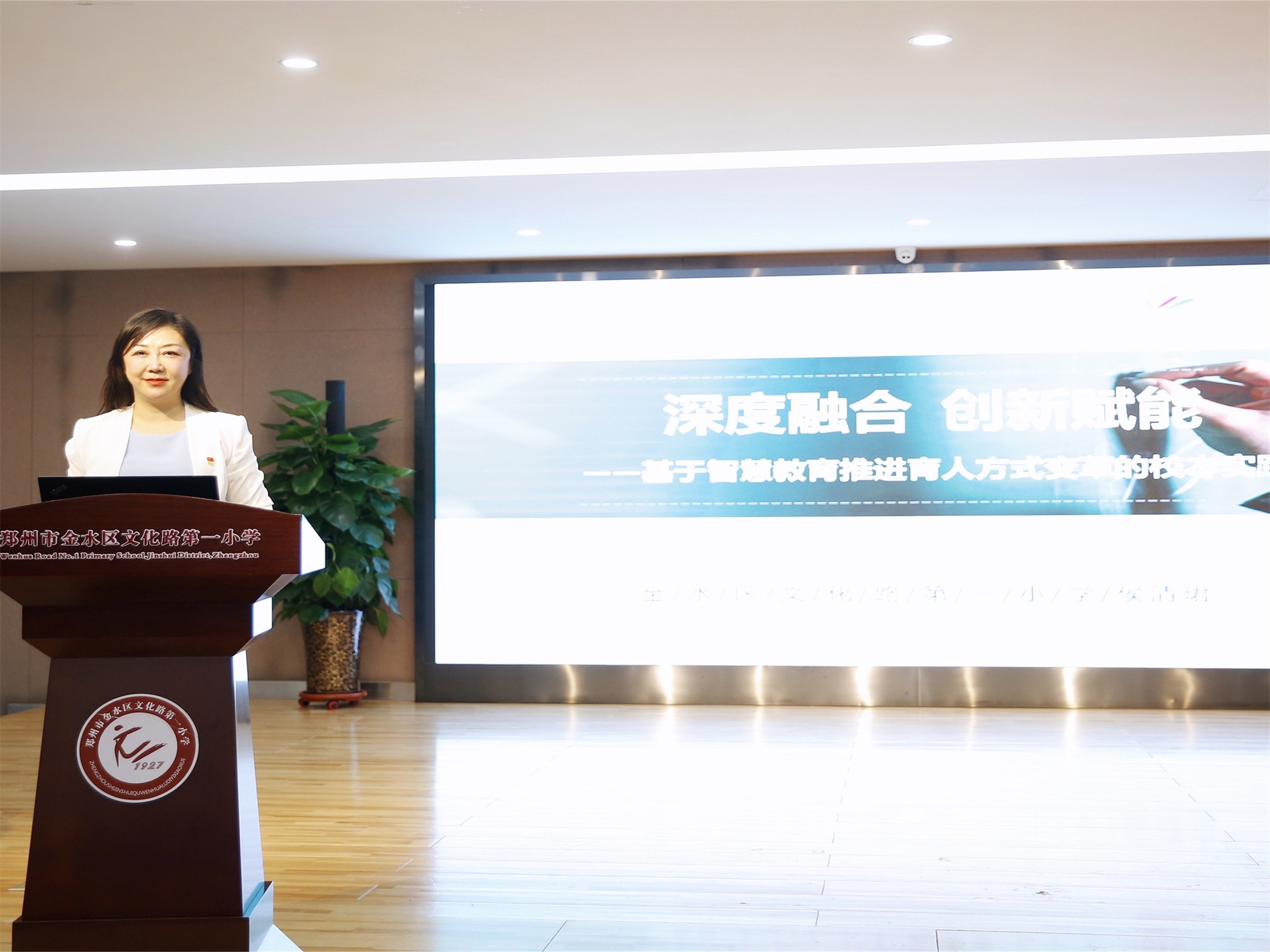 4月24日下午,金水区智慧教育项目第一期深化实施与应用推进会在金水区文化路第一小学文汇楼学术报告厅召开。金水区文化路第一小学党总支书记、校长侯清珺在会上以《深度融合 创新赋能——基于智慧教育推进育人方式变革的校本实践》进行了智慧课堂建设经验分享。
