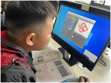 学生实践,通过学习,六年级scartch编程课在电脑教室学习,学生可以自主设计并制造一个完整程序。