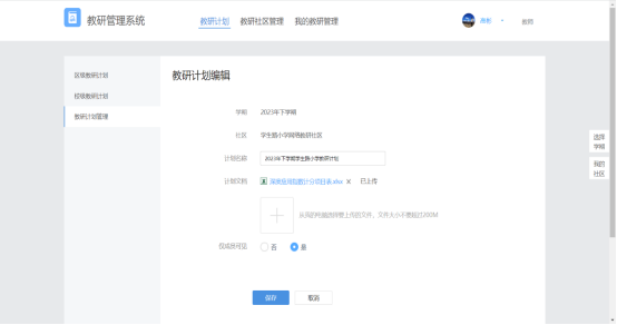 学校在每学期初在云平台制定全校的教学计划并分发到教研组,教研组在根据学校的教学计划通过云平台制定出合理的教研计划并分发到每位教师。教师通过计划制定出自己的教学计划,并根据计划在云平台中附带上自己的白板课件、教案、资源以及课堂实录,及丰富了学校的教学资源库,也可以使教研组为单位对教师的某一节课进行研课和磨课活动。使学校的教研活动能真正的做的以信息化为支撑,促进并提高教师的信息化素养。