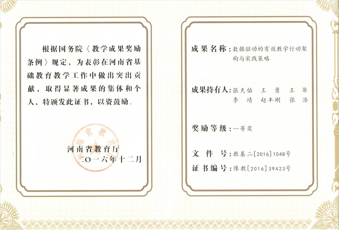 2016年,《数据驱动的有效教学行动架构与实践策略》荣获省基础教育成果一等奖