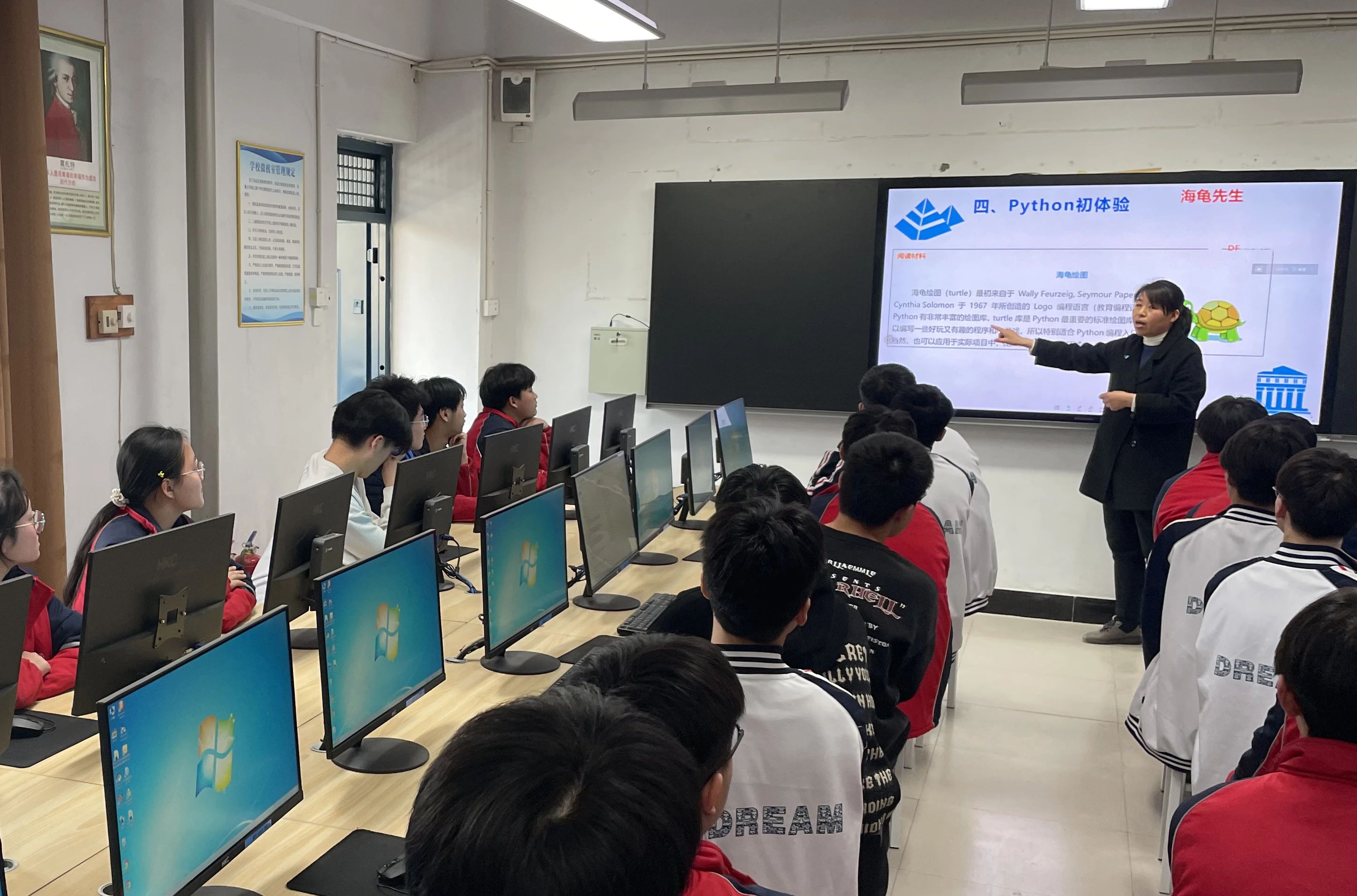 本次人工智能Python编程社团的60名成员,来自于我校高一和高二年级。该社团的课程紧密结合海龟绘图,融合语数英等多门学科知识,有利于提升学生的专注力和创造力,锻炼数理逻辑思维能力。社团课程通过“教、练、赛”等形式,帮助学生提升解决问题和逻辑思维的能力,从而提升信息化素养。