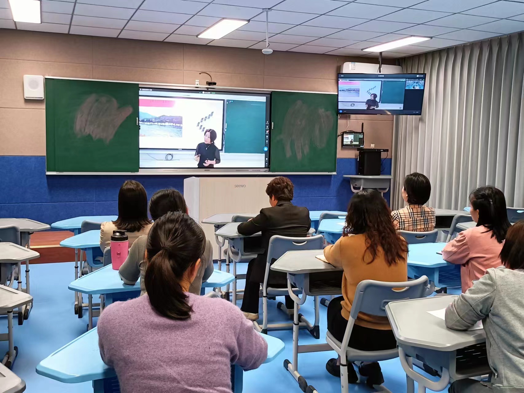 近日,学校校园建设再添新成果。新建一间智慧教室(文泽楼四楼)最新建成的新型智慧教室配备集录播教室、双师课堂、互动课堂多种功能于一体,可通过网络、录播系统、教学互动系统,实现两个教室画面、声音实时互动,两个教室都可以给对方进行远程授课,远程学生还可以实时提问互动,实现真正意义上的“同上一节课”。还可以实现云录播和督导巡课全覆盖。全程一键录制,生成的课程视频将自动上传至教学资源平台,供更多师生重复学习观看。其中,互动研讨型智慧教室改变了传统教室的形态,配备可灵活移动的新型桌椅、多屏交互一体机、全覆盖无线网络等,极大拓展了教学空间,为师生营造了“处处可书写,处处可研讨”的教学环境,有利于激发学生学习兴趣,有效提高学习效率。