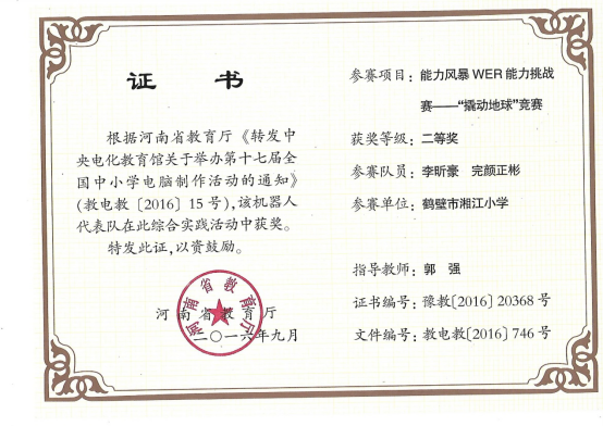 我校教师积极指导学生参加各类信息化比赛与活动,提升学生信息创造与应用能力。近年来,在全国中小学生电脑制作活动、世界教育机器人大赛、中国青少年机器人竞赛、河南省青少年机器人竞赛、河南省青少年电子制作锦标赛、河南省航空航天模型锦标赛、鹤壁市青少年机器人竞赛等活动中屡获殊荣。