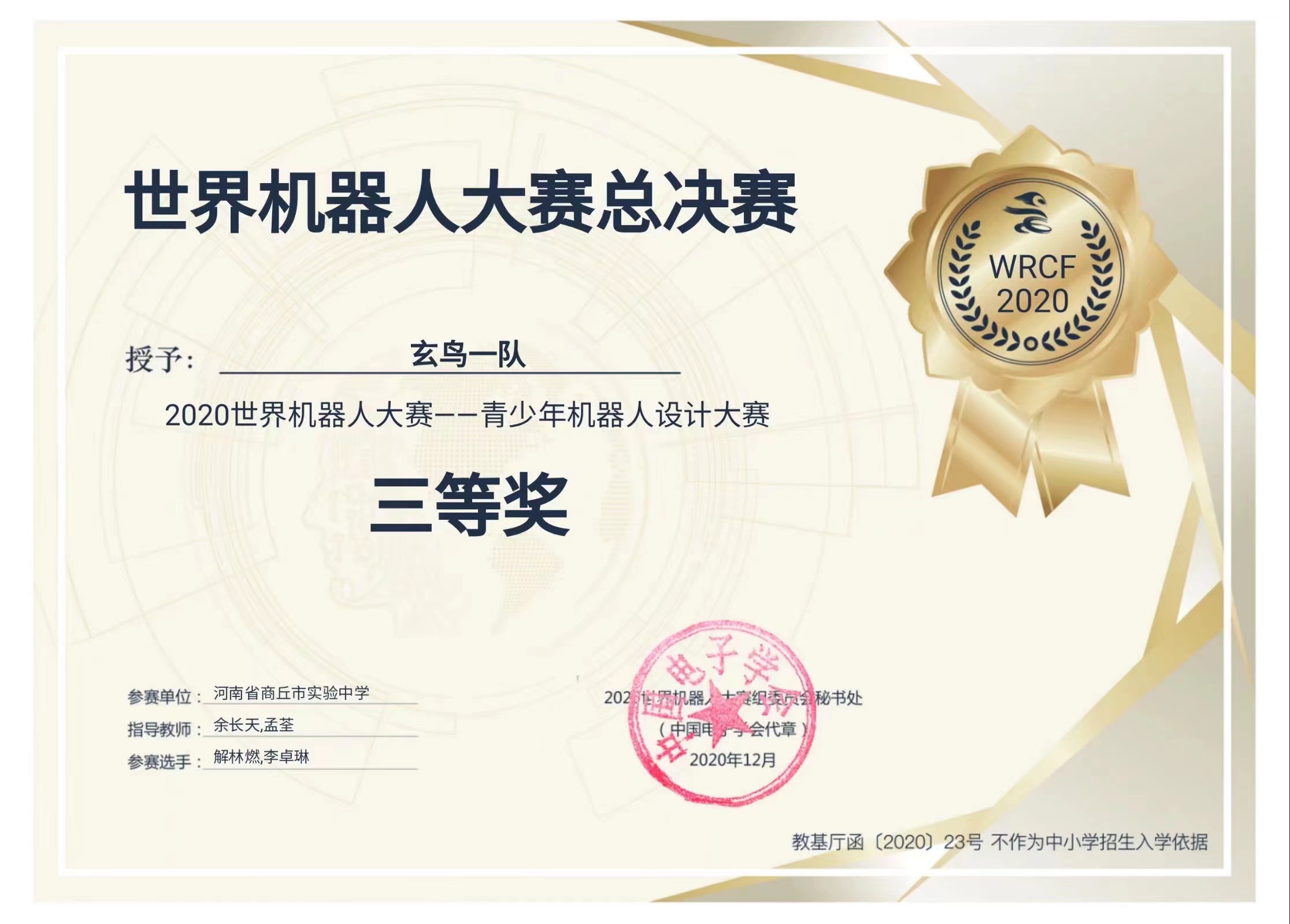 12月3日至6日,2020世界机器人大赛总决赛在广东佛山举行,我校代表队荣获三等奖。此项比赛是我校今年开展人工智能社团以来的首次比赛,虽因为比赛中的一点小失误没有取得预想中的好成绩,但仍然是我校人工智能教育热烈开展的缩影,为我校成立不久的人工智能社团开了一个好头。