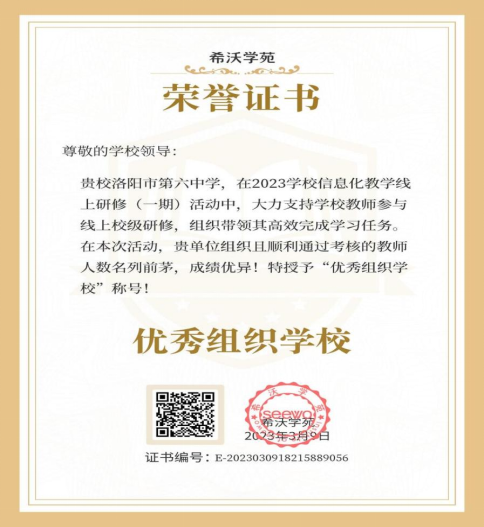 学校领导全力支持此次线上研修培训,并积极参与学习,做好榜样示范作用。 在全校教师共同努力下,学校获得“信息化教学线上研修优秀组织奖”。本次线上研修活动为六中信息化2.0提升工程工作的有效开展积累了有益经验。通过培训,教师能够初步掌握希沃白板使用方法,并熟练操作希沃白板5进行授课。通过培训,我校教师能够充分利用希沃白板5的功能与特点,对传统课堂教学进行改进,不断丰富与优化课堂教学的内容与形式、不断提升教育信息资源的使用效益、不断提高课堂教学质量和效率。 通过培训,掌握信息化集体备课的方法,优化教师教学、教研与办公效率。我们将以此次培训为契机,继续深入研究信息化教学,躬身实践,利用希沃白板等现代化智慧教学,为课堂添色助力。