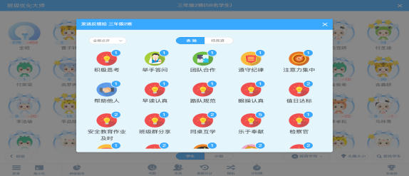 通过“班级优化大师”可以记录在教学中许多的“细节”。比如正确的坐姿,读书的姿势,回答问题声音响亮等等,这些都是可以每堂课的一点一滴小事抓起,同时适时加分,对课堂中专心听讲积极参与的同学是一种精神奖励;适时减分,对于听讲习惯不好的同学则是一种提醒和惩戒,教师可以通过评价来强化学生行为习惯的转变,同时有利于班级良好班风学风的转变。教师可以发送点评,分数排名即时刷新,从而激发学生好胜心,实现课堂氛围一键优化。