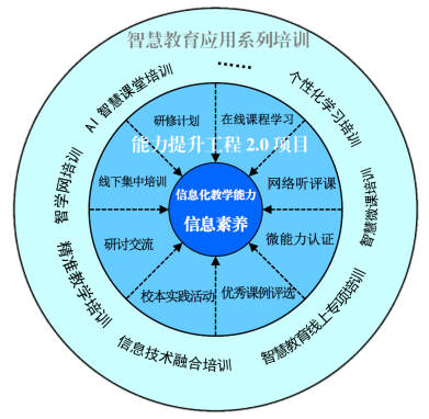 教育信息化,关键在教师。学校搭建以能力提升工程2.0为内环,以智慧教育应用系列培训为外环的“双环”培训模型,统筹网络听评课、AI智慧课堂、智学网培训、精准教学等各项培训。