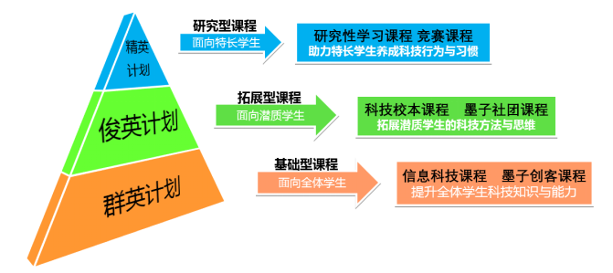 为培养全体学生的科技素养,学校经过了十余年的摸索实践,选择了以课程建设路径为主的科技教育开展路径,依托墨子创客课程群等课程,统筹科技社团课程、研究性学习课程和竞赛课程,构筑了金字塔型科技教育课程体系模型。
