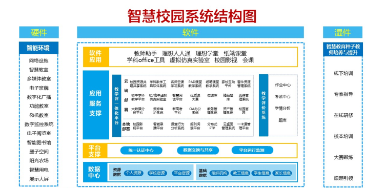 十年探索,学校从硬件、软件、湿件三个方面搭建并实践了智慧校园系统结构模型(如图2),营造了信息化教学环境。打造多功能语音教室、数字广播系统、人工智能实验室、智能录播教室、墨子创客课程、智能图书馆、阳光农场等硬件环境。建设教学及管理一体化的智能平台,集成了智慧教学、智慧管理、智慧学习、智慧研修、智慧评价、智慧家校、智慧成长等多个模块。所谓“湿件”,是指硬件、软件以外的“人件”。我校从多个方面促进教师信息素养不断提高、革新教师教育观念以适应新的教学模式。