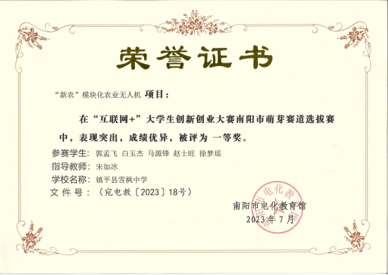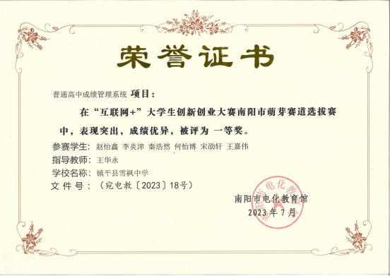 热烈祝贺镇平县雪枫中学信息中心在“互联网+”大学生创新创业大赛南阳市萌芽赛道选拔赛中荣获双“一等奖”!