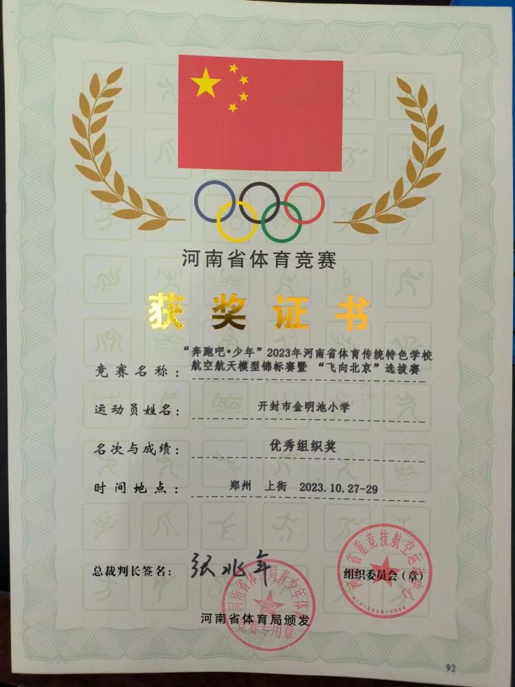 开封市金明池小学荣获河南省航空航天模型锦标赛暨“飞向北京”选拔赛优秀组织奖。