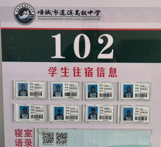 一、学生宿舍信息公示:为了方便宿管老师管理,每个寝室门口都制作了学生信息公示栏,在公示栏内有学生的基本信息包括姓名、班级、床位号等,同时每个学生一个条形码,该条形码包含了学生的应急联系人信息,一旦发现学生有紧急情况,宿管及学校老师可通过扫码与家长或班主任进行联系,为了保护学生隐私,所有与学生有关的关键信息都隐藏在一个小小的条码中,只有通过扫码并输入密码后,才可以查看。