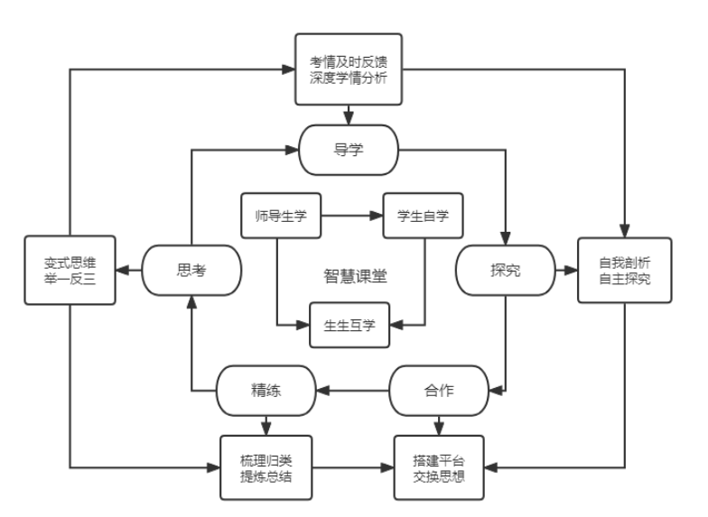 “三环一心”即以智慧课堂为中心,第一环为:学生自学——生生互学——师导生学;第二环为:导学——探究—合作——提炼——思考;第三环:基于AI大数据的考情及时反馈、深度学情分析——学生自我剖析自主探究——搭建平台,交流思想——梳理归类,提炼总结——变式思维,举一反三。
