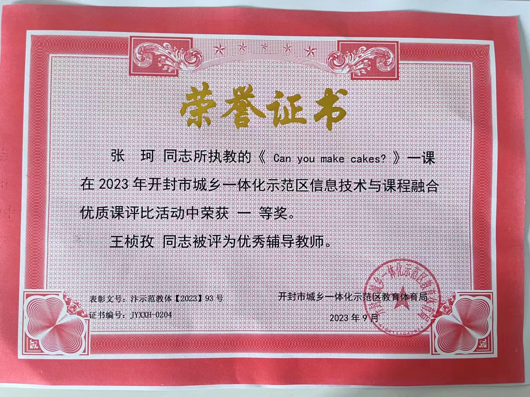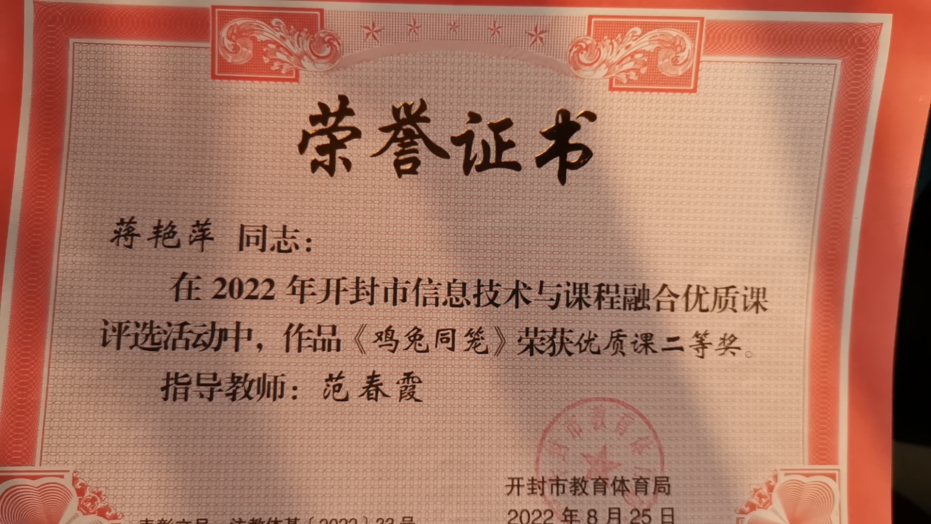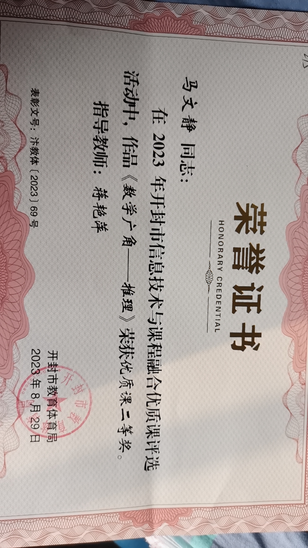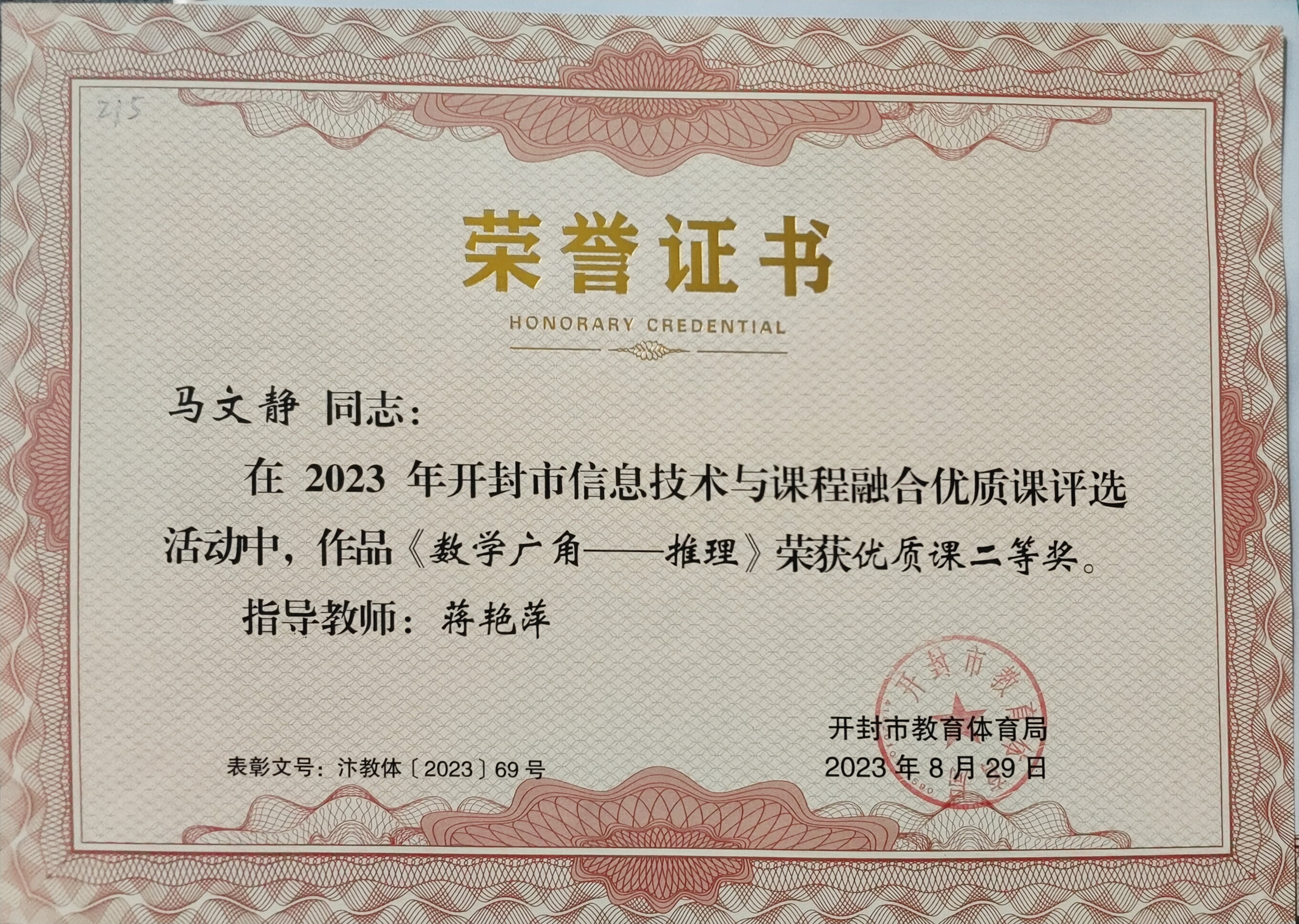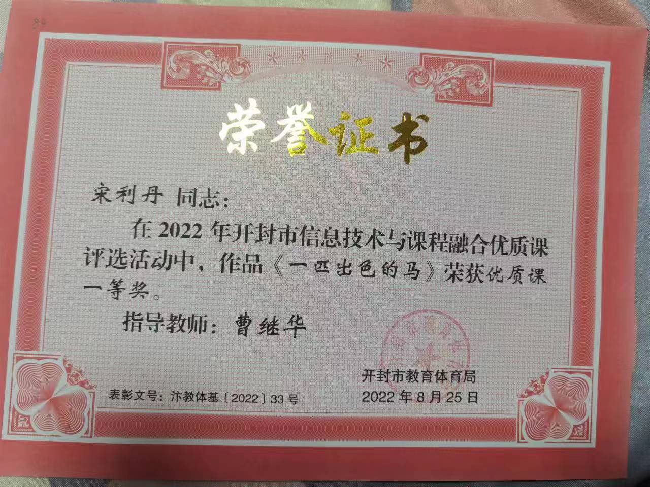 金明池小学教师获得的信息技术与课程融合优质课获奖证书