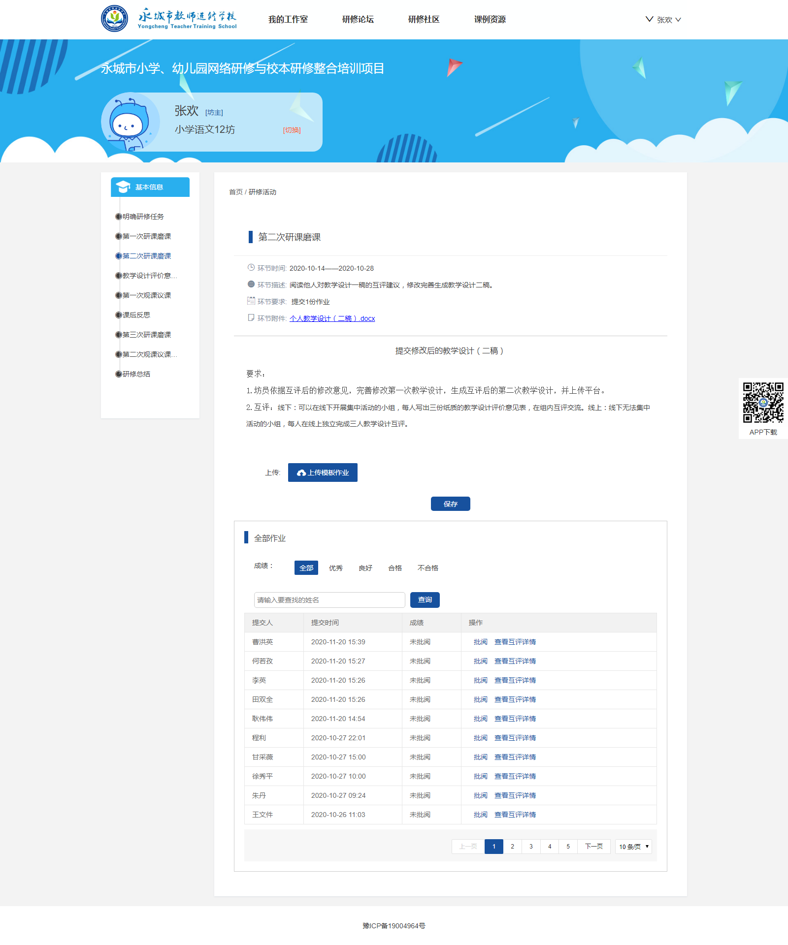 6.研修成果有展示。坊主对本教研组的成果进行实践测评,校内组织推动教研组、校区内赛课、评优课活动;由校级管理员对学员作品集进行实践测评,成绩上传至平台。