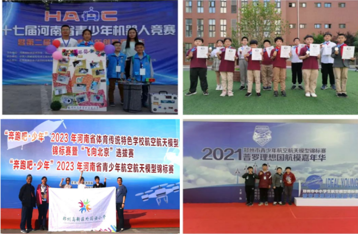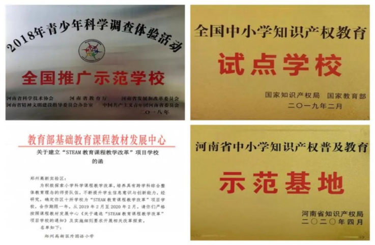 在数字校园建设与发展中,不论是理论经验的积累,还是工作实践的探索,外国语小学都获得了喜人成绩。先后荣获郑州市研究性学习先进学校,河南省中小学知识产权普及教育示范基地、河南省中小学人工智能教育实验学校、青少年科学调查体验活动全国推广示范学校、全国中小学知识产权教育试点学校、“省培计划”中小学教师信息技术应用能力提升工程2.0样板校项目(郑州市)优秀项目学校、河南省中小学数字校园标杆校、郑州市中小学教师信息技术应用能力提升工程2.0示范校,相关实践成果连续五届参展中国教育创新成果公益博览会,被课程教材研究所确定为“STEAM教育课程教学改革”项目学校。学生参加相关比赛屡获佳绩,郑州市中小学生科学运动会金奖,河南省体育传统特色学校航空航天模型锦标赛暨“飞向北京”选拔赛小学组综合团体第一名,河南省青少年电子制作锦标赛小学组团体第一名,河南省青少年机器人竞赛团队银奖等。
