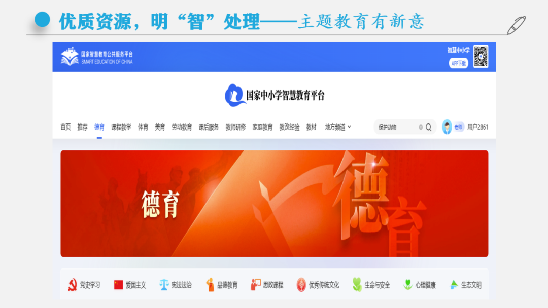 教学资源的选择与运用,一直是摆在我们面前的课题。优质教学资源的开发与作用,能够为教育教学的顺利开展与质量提升赋能。国家中小学智慧教育平台就是一个技术更为与时俱进、功能更加立体多样、效果更能直抵人心的技术手段与平台。平台中的资源对建设思政课程、开展主题教育、建设校园文化起到重要作用。