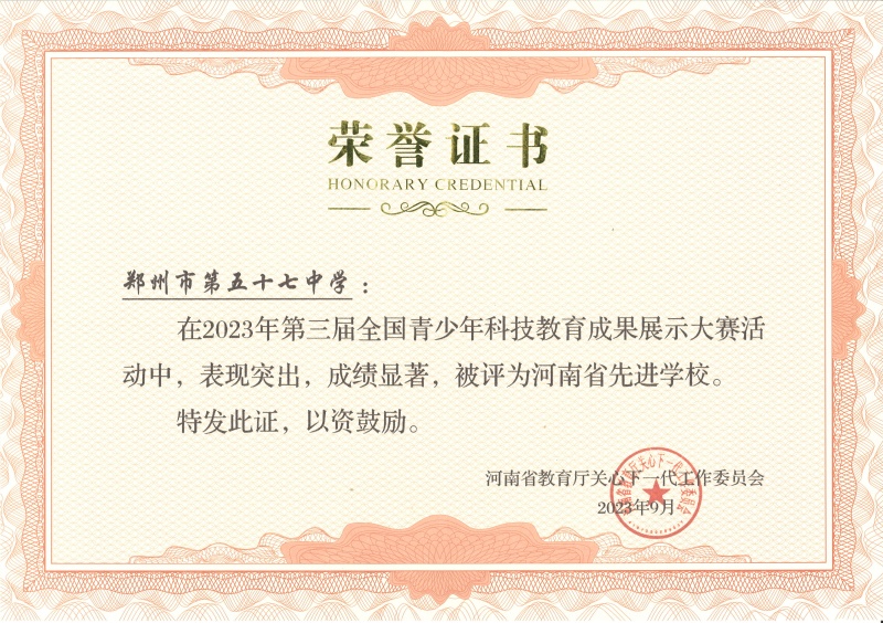 郑州市第五十七中学 获得全国青少年科技教育成果展示大赛河南省先进学校