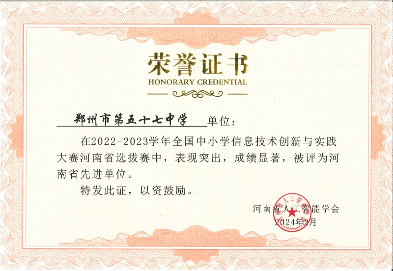 郑州市第五十七中学 获得全国中小学信息技术创新实践大赛河南省先进学校