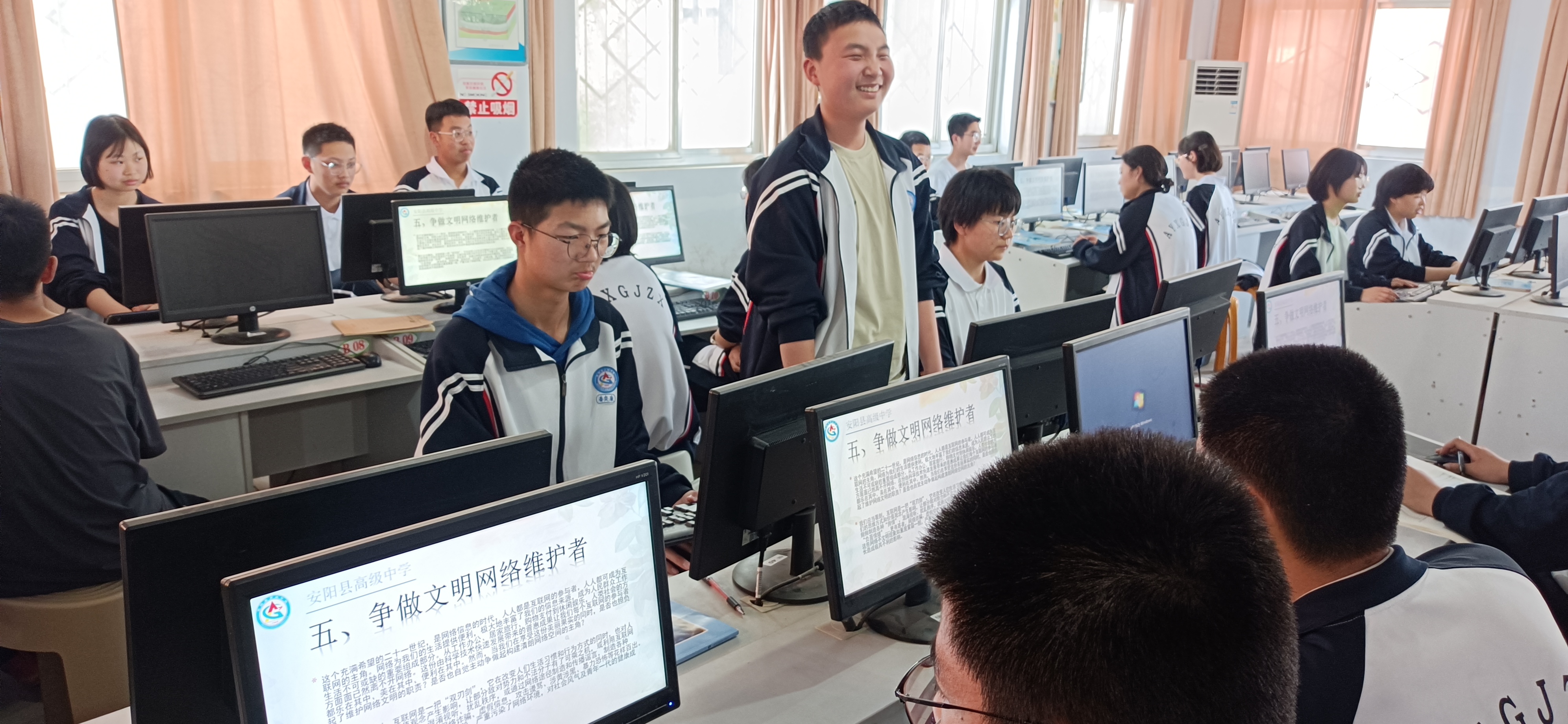 4月22日至4月26日,安阳县高级中学信息处在学生微机室举行“优化数字校园环境,争当文明网络维护者”主题教育周活动。活动由校信息处主办,主讲教师由高一、高二信息技术教师担任,取得了优良的教育效果!