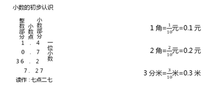 | 教学重点: 1. 会认、读、写不超过两位的小数,了解以元或以米为单位的小数的含义。 教学难点: 1. 理解十分之几可以写成一位小数。 |