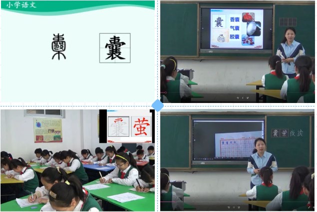 于是李老师改变思路,在课堂上这样实施“囊”字的识字写字教学:利用多媒体出示“囊”的图片,让学生猜想“囊”最初的意思是什么?引起了学生对这个字识字兴趣;又让学生结合生活经验给其组词,学生兴致盎然地回忆了生活中的相关词语——香囊、气囊......加深了对字印象;紧接着学生自己分析这个字的字型结构,在此基础上教师进行范写,学生书空,临写,同时出示“囊”字的书写视频。这一环节的设计让学生在书写时知道:如何写得更工整美观,从而态度也更加端正。学生写完之后,李老师利用展台展示个别学生的字,学生更直观地发现同学在写“囊”字时出现的问题,从而提醒自己再次书写修正,让自己的书写更加规范。