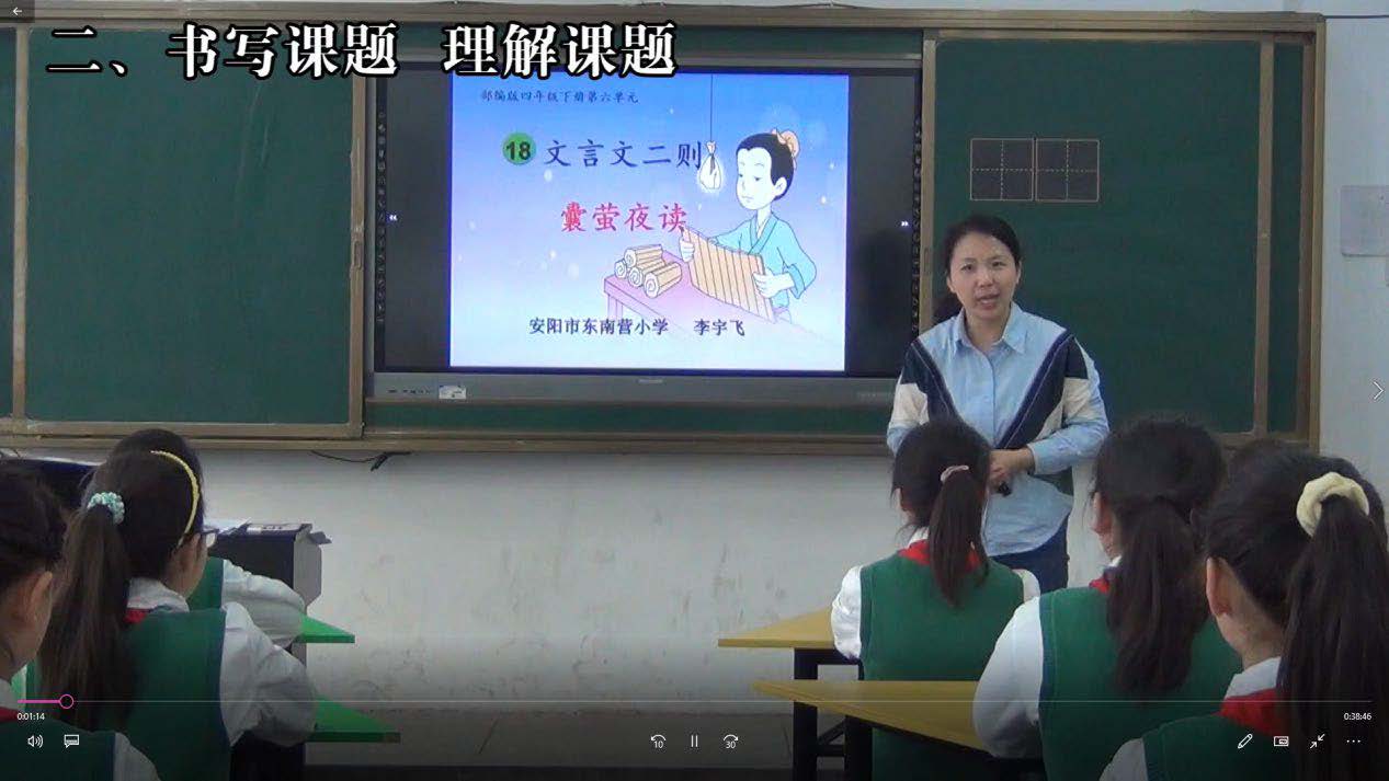 2023 年2 月,我校李宇飞老师参加了文峰区信息技术与课程融合优质课评比,所讲课题为统编版语文四年级下册第六单元《文言文二则》的第一课时——《囊萤夜读》。文言文的学习,对四年级的学生来说并不是第一次,他们之前学习过《司马光》《精卫填海》《王戎不取道旁李》等经典文言文,有一定的学习经验。于是在本节课的课堂教学中,李老师通过回顾导入,理解课题;初读课文,扫清字词障碍;再读课文,理解文意;研读文本,体会品质;拓展延伸,巩固方法等环节,让学生掌握学习文言文的方法,进而达到热爱国家文字,热爱中华文化进而继承和弘扬中华优秀传统文化的目的。