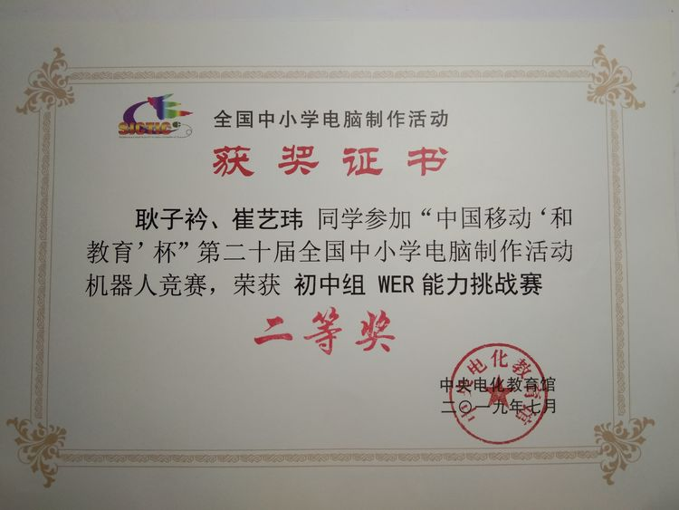 第二十届全国中小学电脑制作活动在山东潍坊科技学院举行,河雍中心校学生耿子衿、崔艺玮代表河南省参加比赛。经过激烈的角逐,河雍中心校学生耿子衿、崔艺玮继荣获WER能力挑战赛初中组河南省冠军后又获得了全国第6名、二等奖的好成绩。