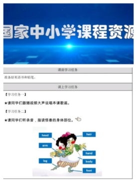 我们开始在智慧教育平台上浏览,由于智慧教育平台的小学英语课程没有科普版的,所以不能直接观看本课的教学视频。我们就浏览其他版本和本课内容有关的英语教学视频和语文教学视频。不要问我们为什么会看语文教学视频,语言是相通的,方法是没有界限的。功夫不负有心人,我们在人教版(一年级起点)三年级上册看到有这么一课,题目是My body.这个单元有六个课时,我们把六个课时的教学视频进行了逐一观看,看完之后真是受益匪浅,思路也豁然被打开,备课的思路也清晰起来。