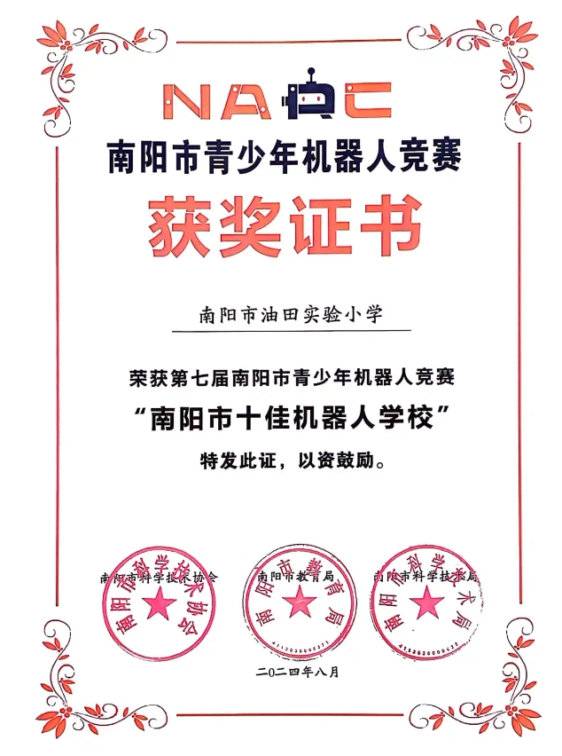 近日获悉,南阳市油田实验小学凭借在机器人教育领域的突出表现,荣获“南阳市十佳机器人学校”的荣誉称号。