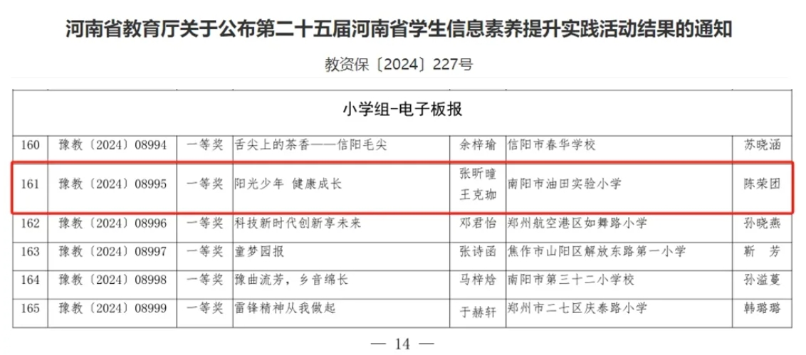 近日获悉,在河南省教育厅主办的第二十五届河南省学生信息素养提升实践活动中,我校张昕曈、王克珈两位同学的作品《阳光少年 健康成长》获一等奖。
